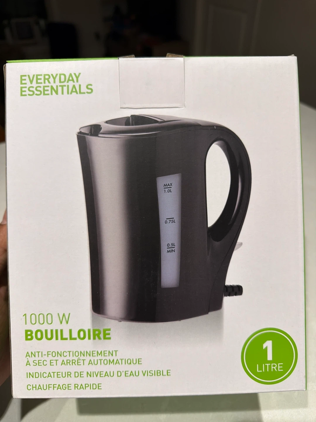 This is an Everyday Essentials 1000W electric kettle with a 1-litre capacity. It features anti-boil dry protection, automatic shut-off, and a visible water level indicator. It also offers rapid heating!