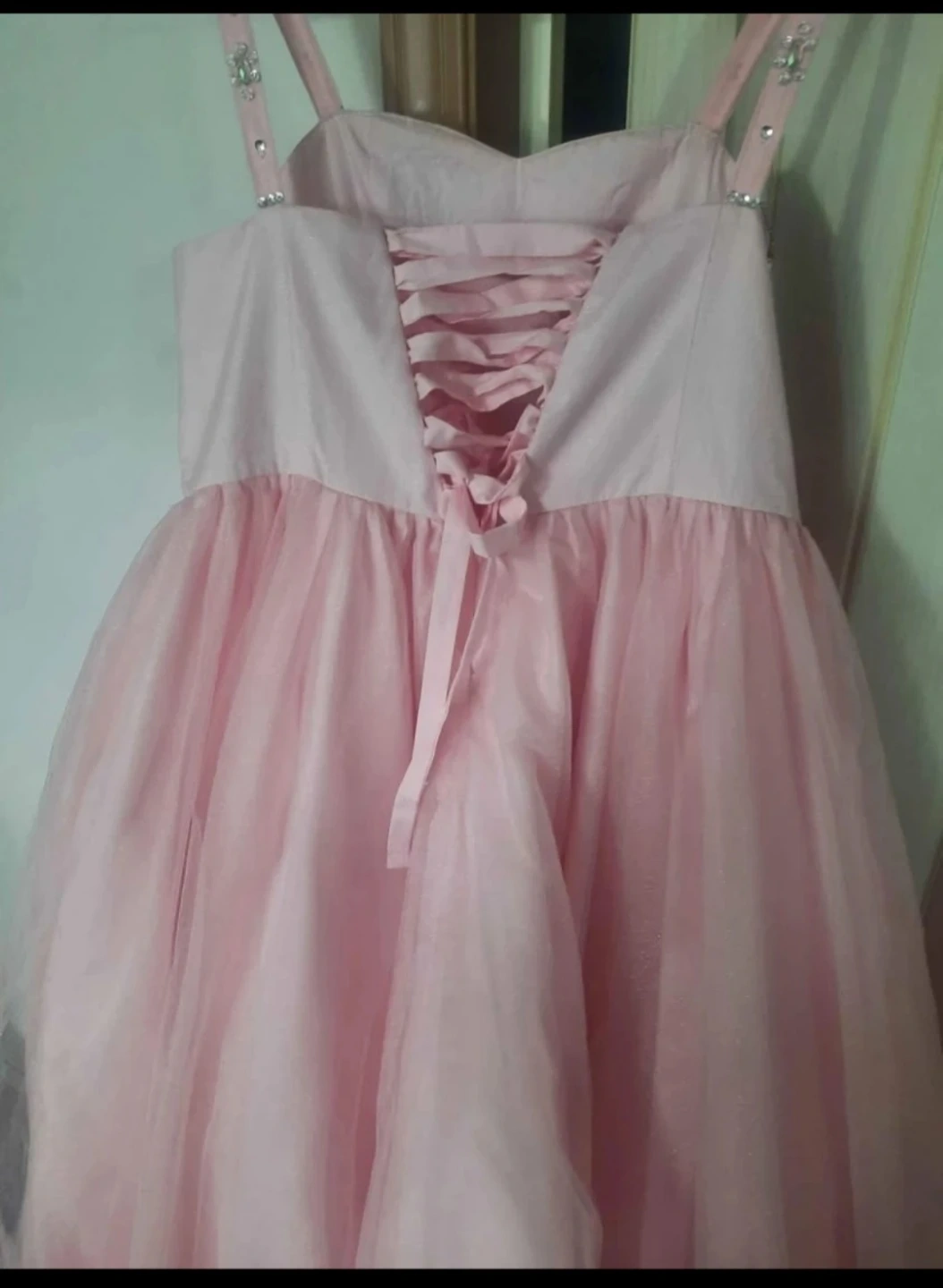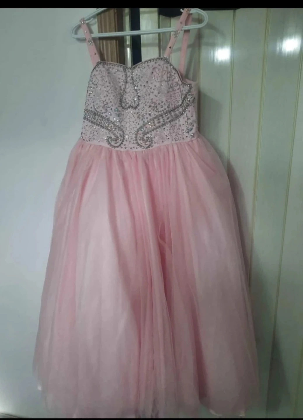 Beautiful pink Cinderella Couture gown with intricate beadwork on the bodice and a full tulle skirt. Features a lace-up back for an adjustable fit. Size 16 girls, Perfect condition worn a few hours