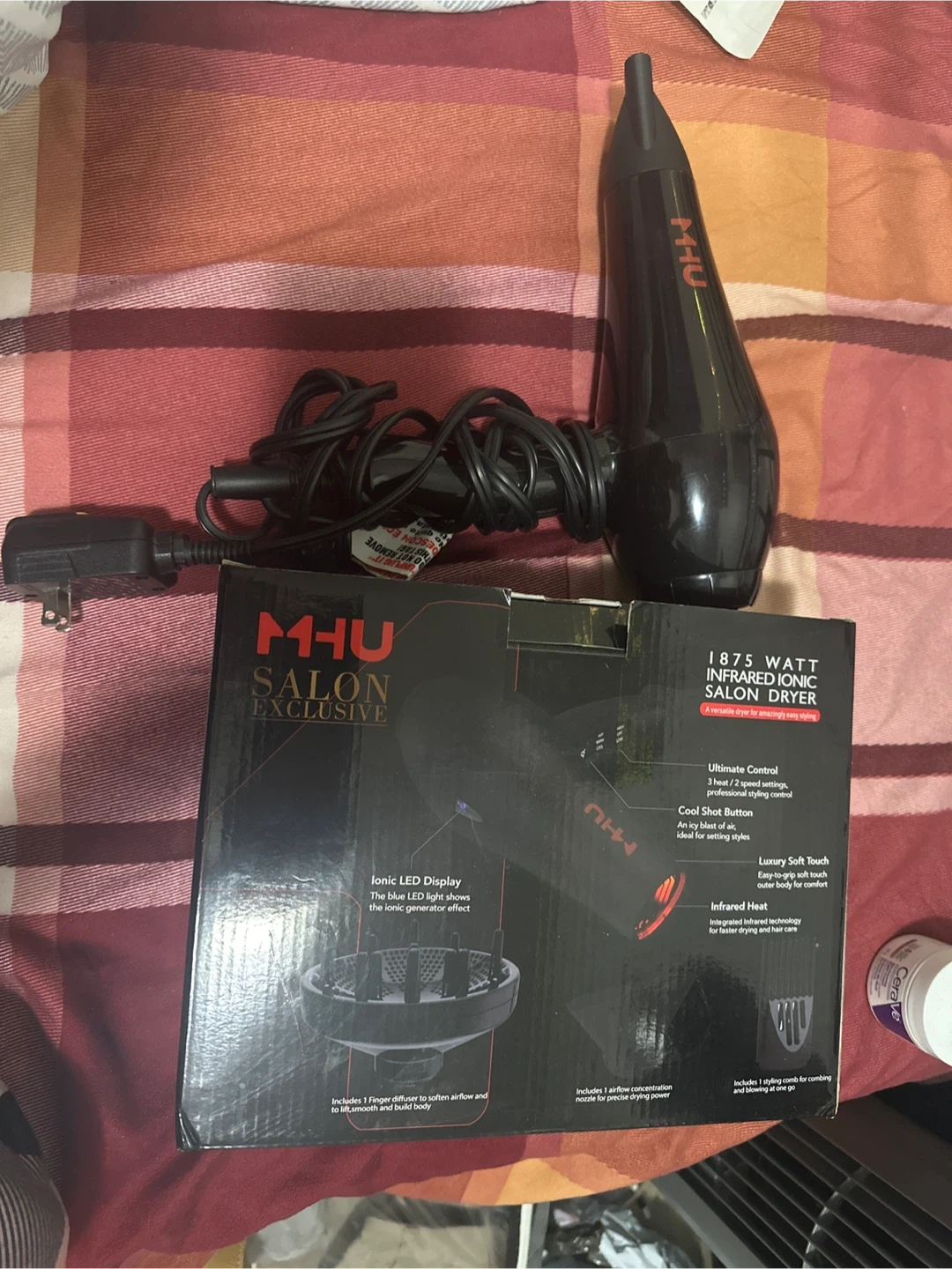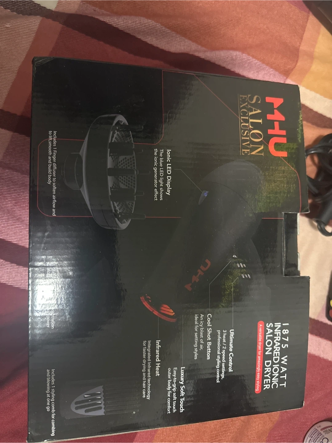 408Looking to sell this MHU salon exclusive hair dryer! It's an 1875 watt infrared ionic salon dryer. It features: - Ionic LED display - Infrared heat - 3 heat/2 speed settings - Cool shot button