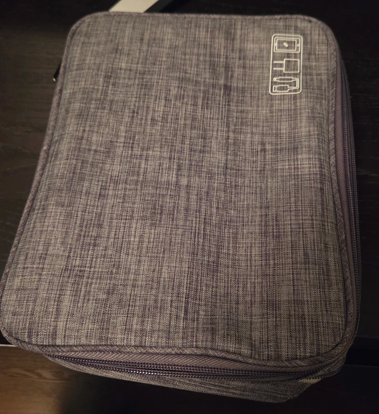 Grey fabric organizer bag for electronics and accessories. It has multiple zippered pockets and elastic straps inside for cables and small items. Great for travel!