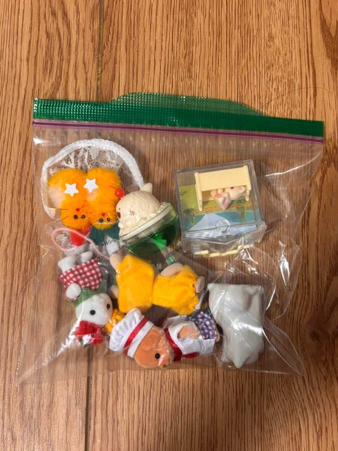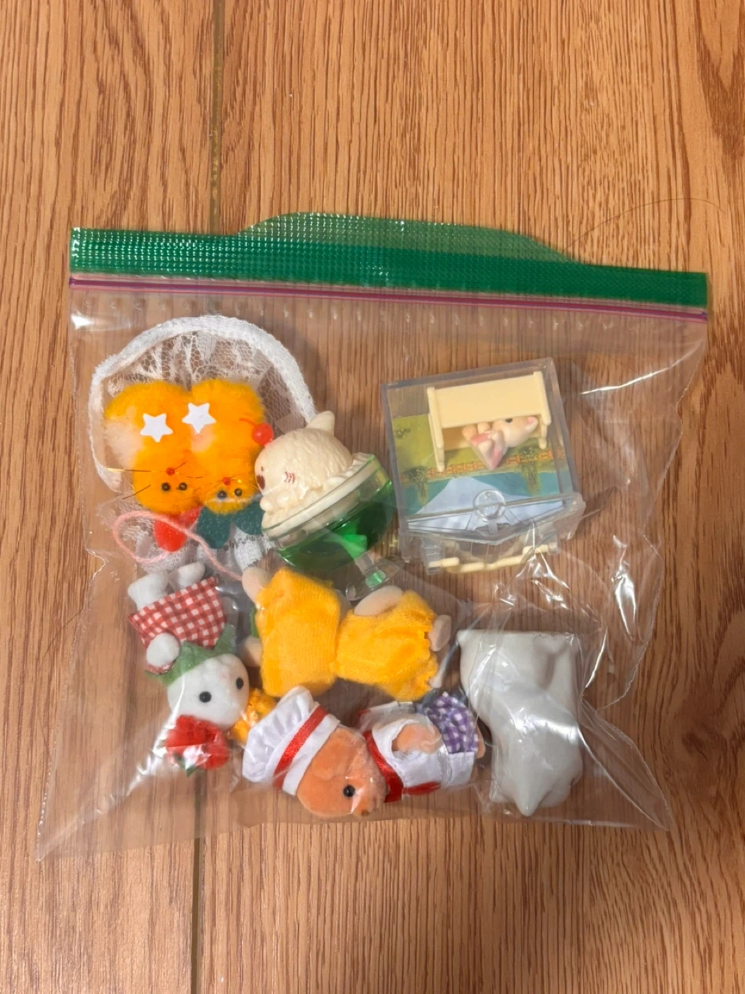 A collection of cute Calico Critters miniature figures and accessories. Includes various animal figures dressed in outfits, furniture pieces, and small accessories. Perfect for imaginative play or expanding a Calico Critters collection!