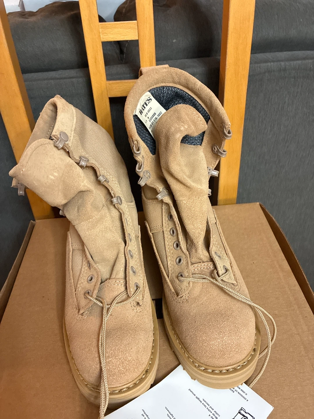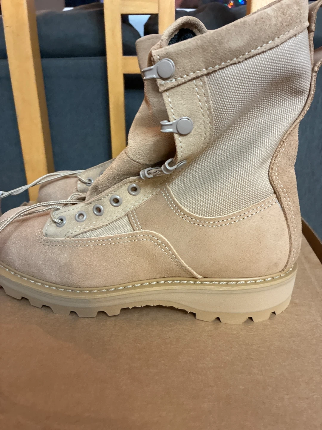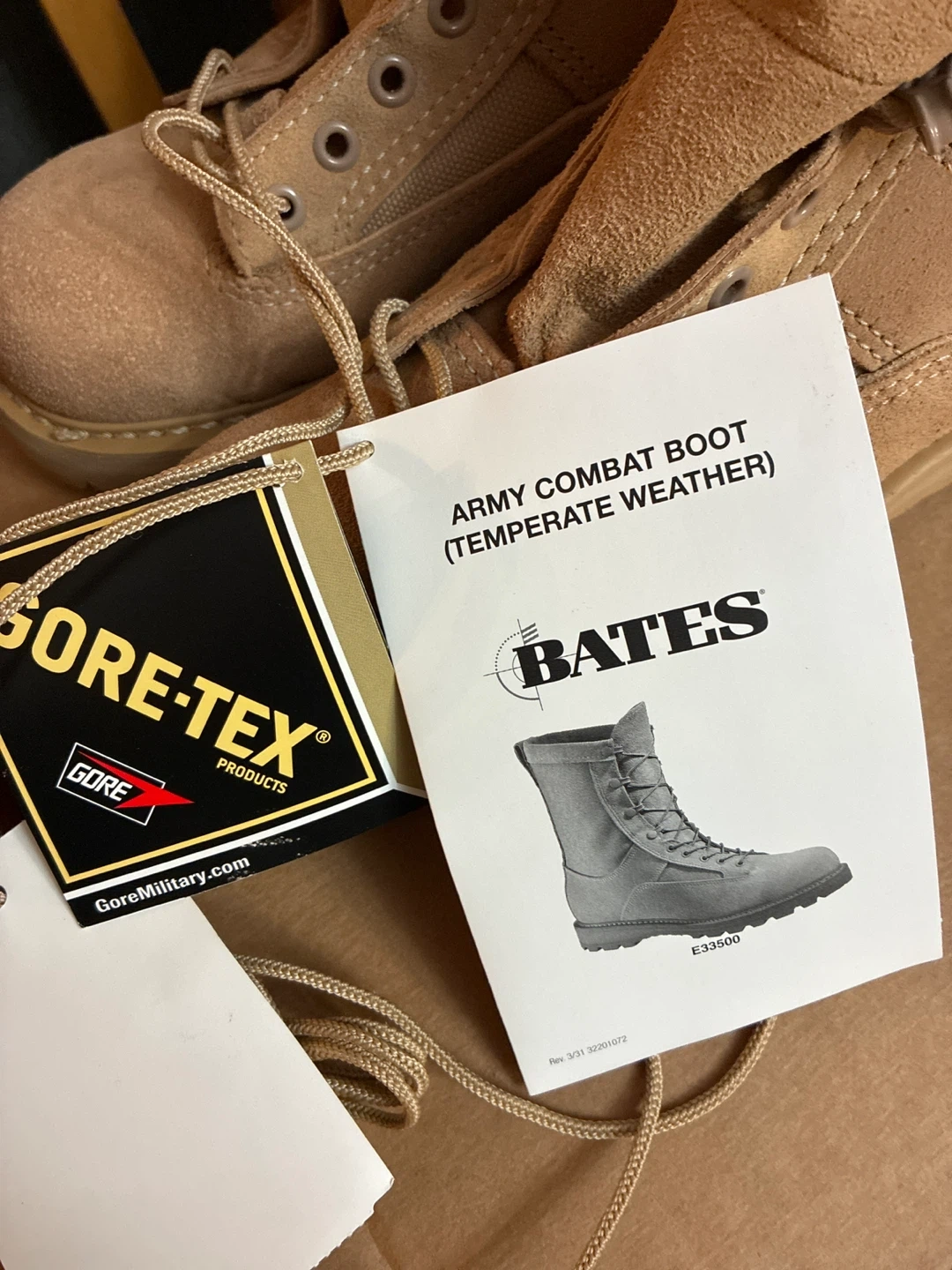 Selling a pair of brand new in the box Bates Army Combat Boots designed for temperate weather. These boots feature Gore-Tex lining for durability and waterproof protection. They are also contamination resistant. The soles are Vibram.