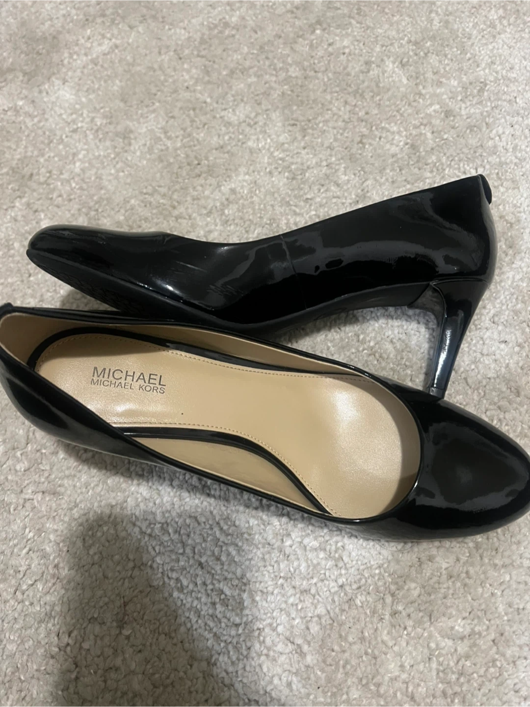 These Michael Kors heels are made with shiny black patent leather. They feature a classic pump design with a comfortable heel height. Perfect for dressing up any outfit!