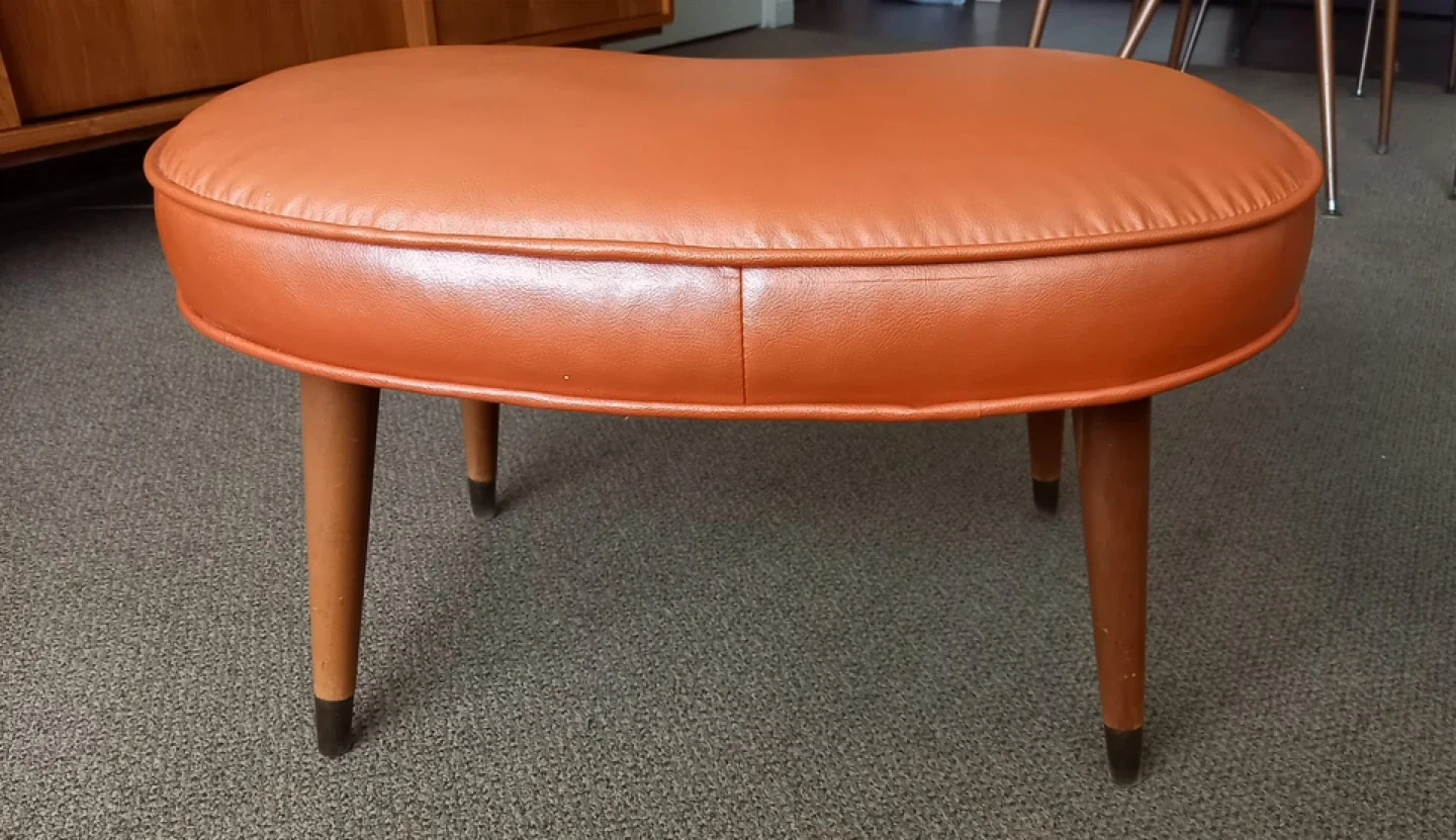 This retro footstool features a kidney bean shape with orange faux leather upholstery. It has wooden legs with metal caps. This ottoman's unique design adds a touch of vintage charm to any space. It's perfect for resting your feet after a long day!