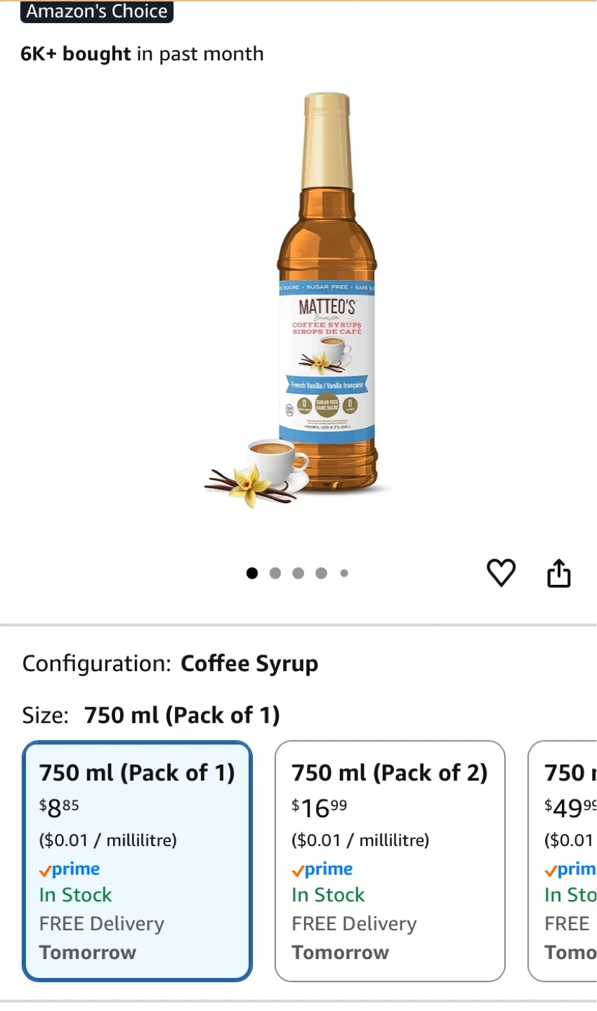 Selling a bottle of Matteo’s Barista Style Sugar-Free French Vanilla Syrup. Bought from Amazon to try in my coffee, but I realized I’m not a big vanilla fan, so I didn’t enjoy the flavor.