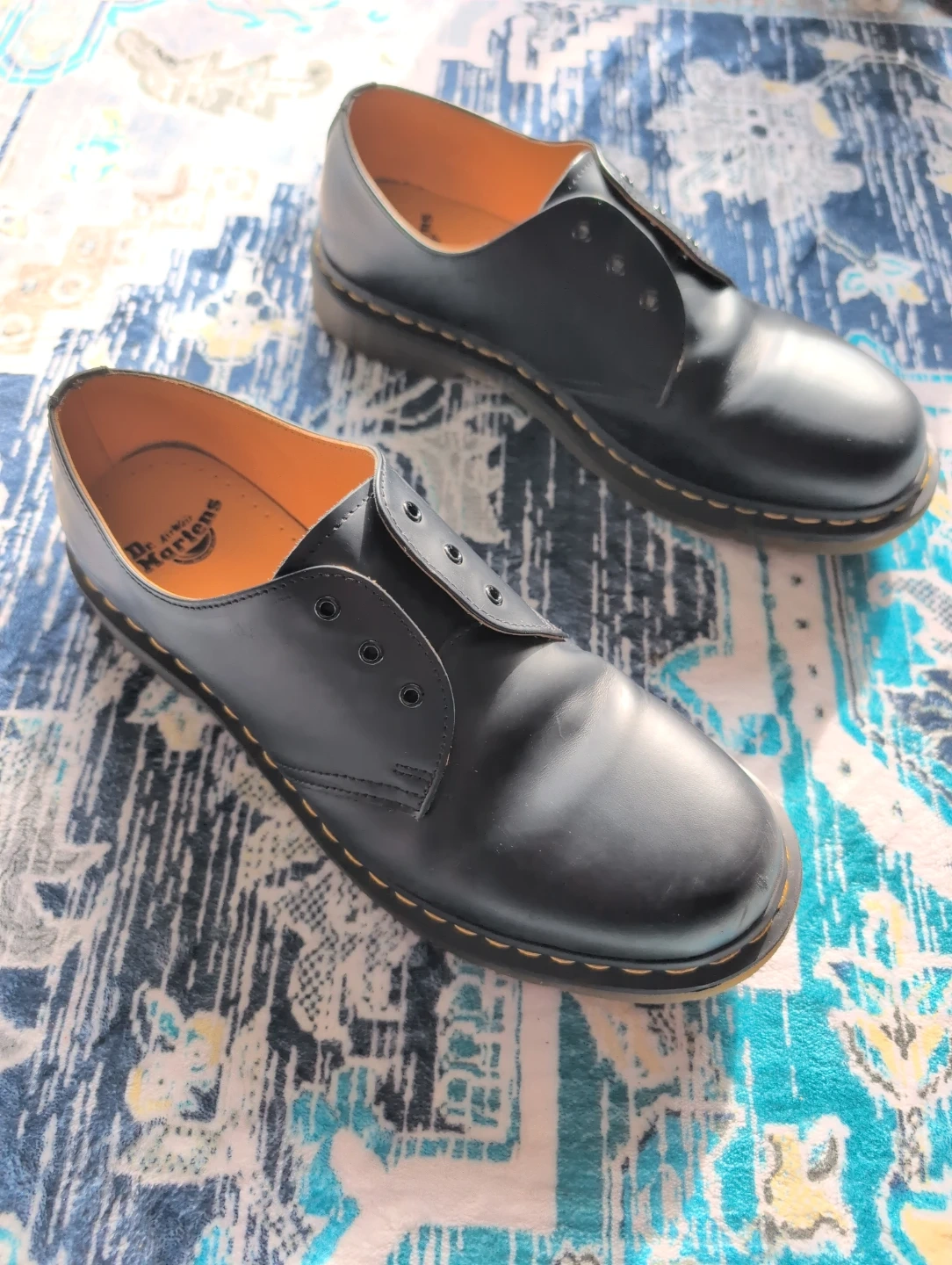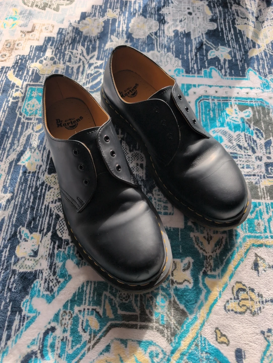 Classic Dr. Martens 1461 shoes in black leather. These are a UK size 11 (US Men's 12, EU 45). They're built with durable Goodyear welt construction. A timeless style that's great for everyday wear.