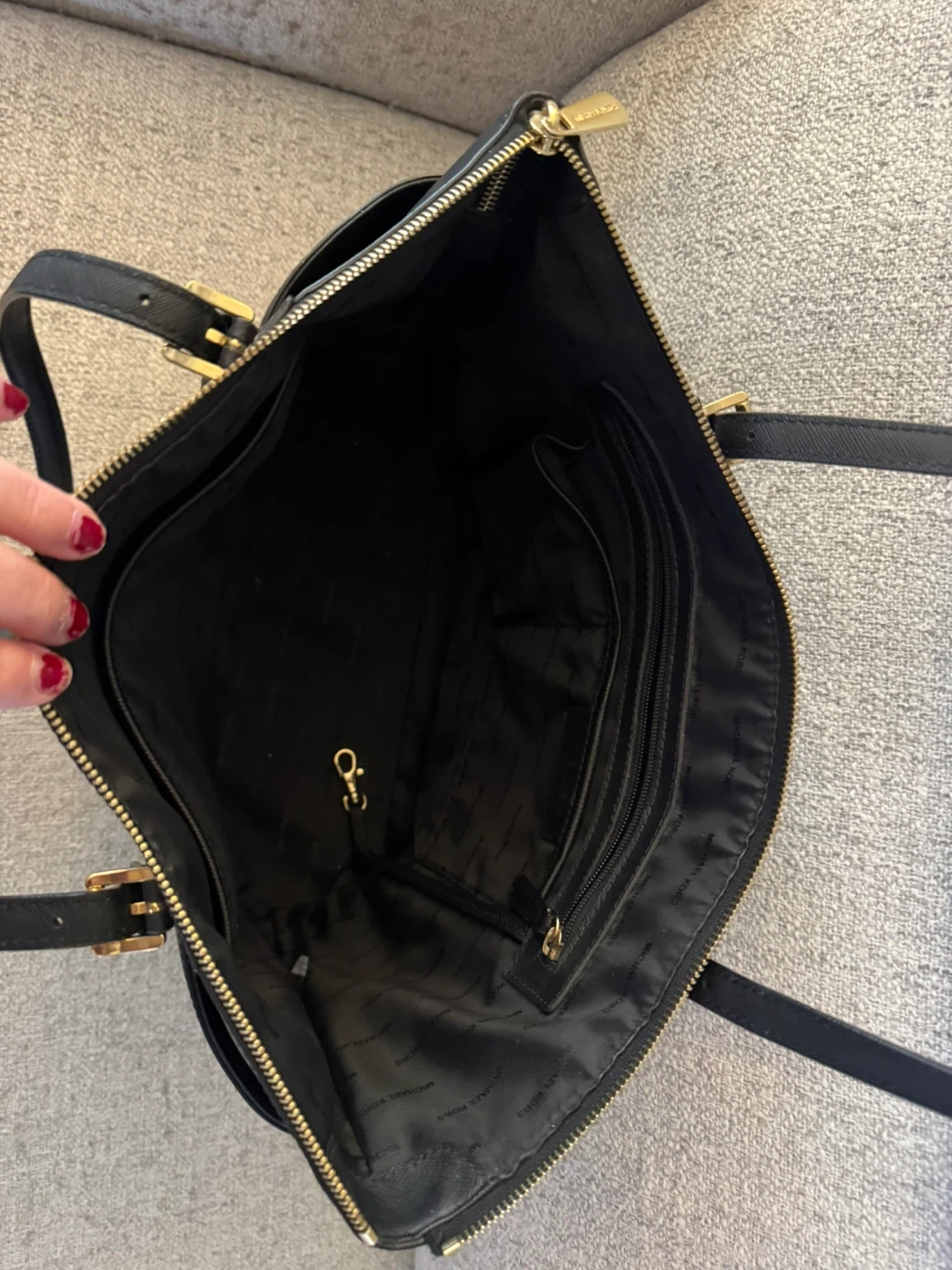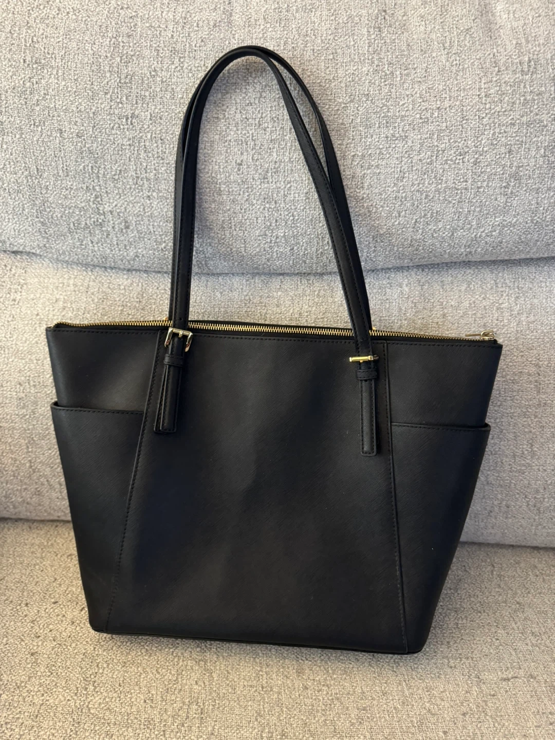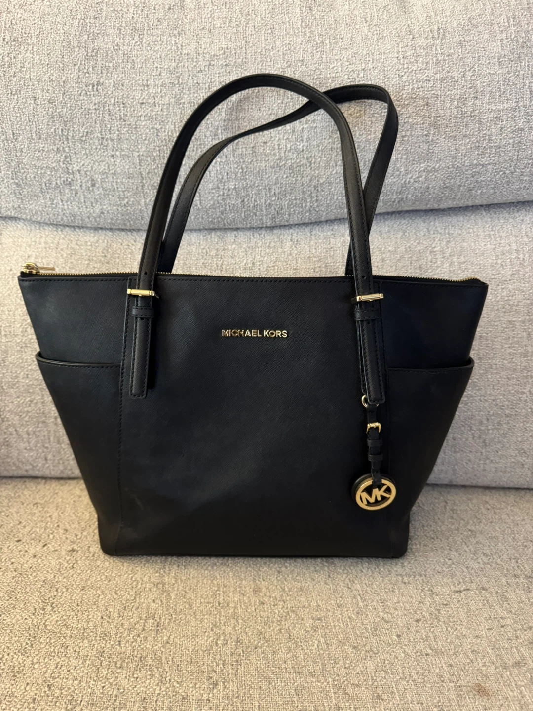 A classic Michael Kors tote bag in black Saffiano leather. It features a zip-top closure and interior pockets. This bag is perfect for everyday use, carrying all your essentials in style.