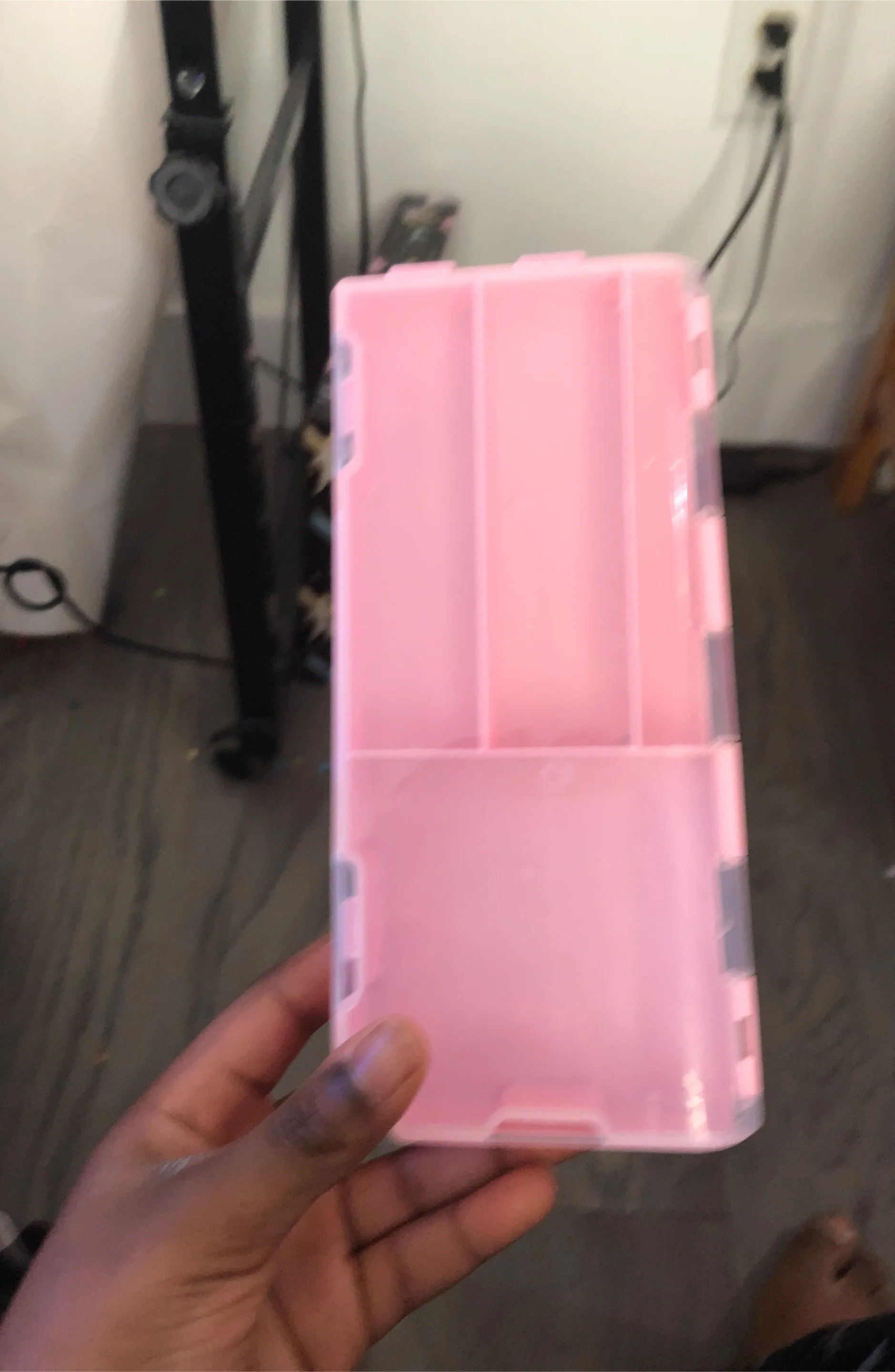 This is a handy pink plastic storage organizer. It has multiple compartments for sorting small items. Great for organizing craft supplies or desk essentials!