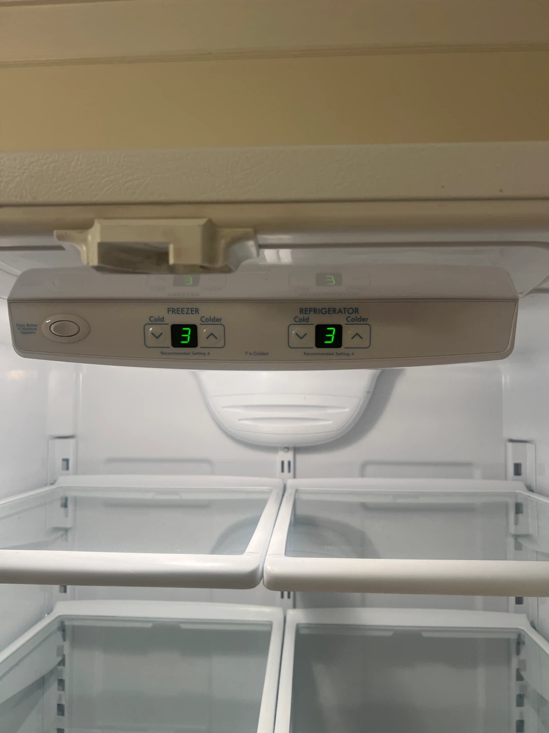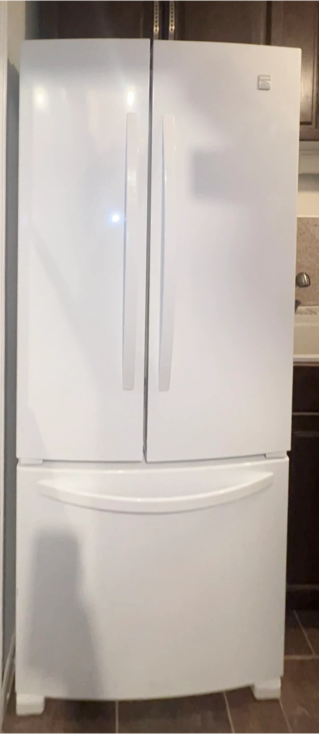 White Kenmore french door refrigerator with a bottom freezer drawer. It's a spacious appliance with adjustable shelving and clear door bins. Great for keeping all your groceries fresh and organized!