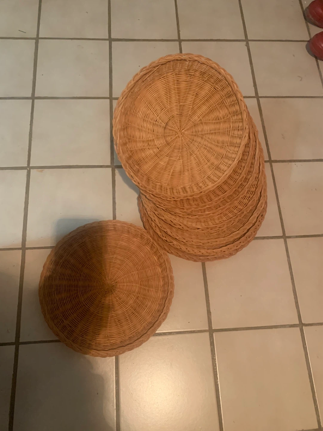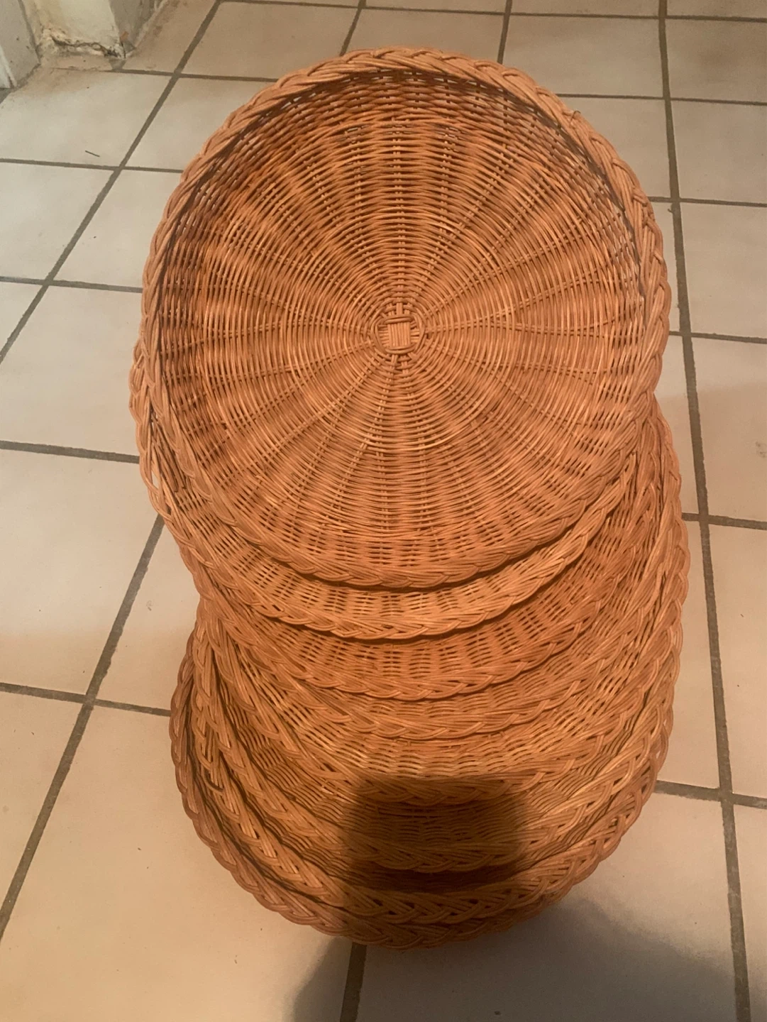 This is a set of 10 woven rattan charger plates. They're a natural tan colour. These would be great for your next dinner party or holiday gathering!
