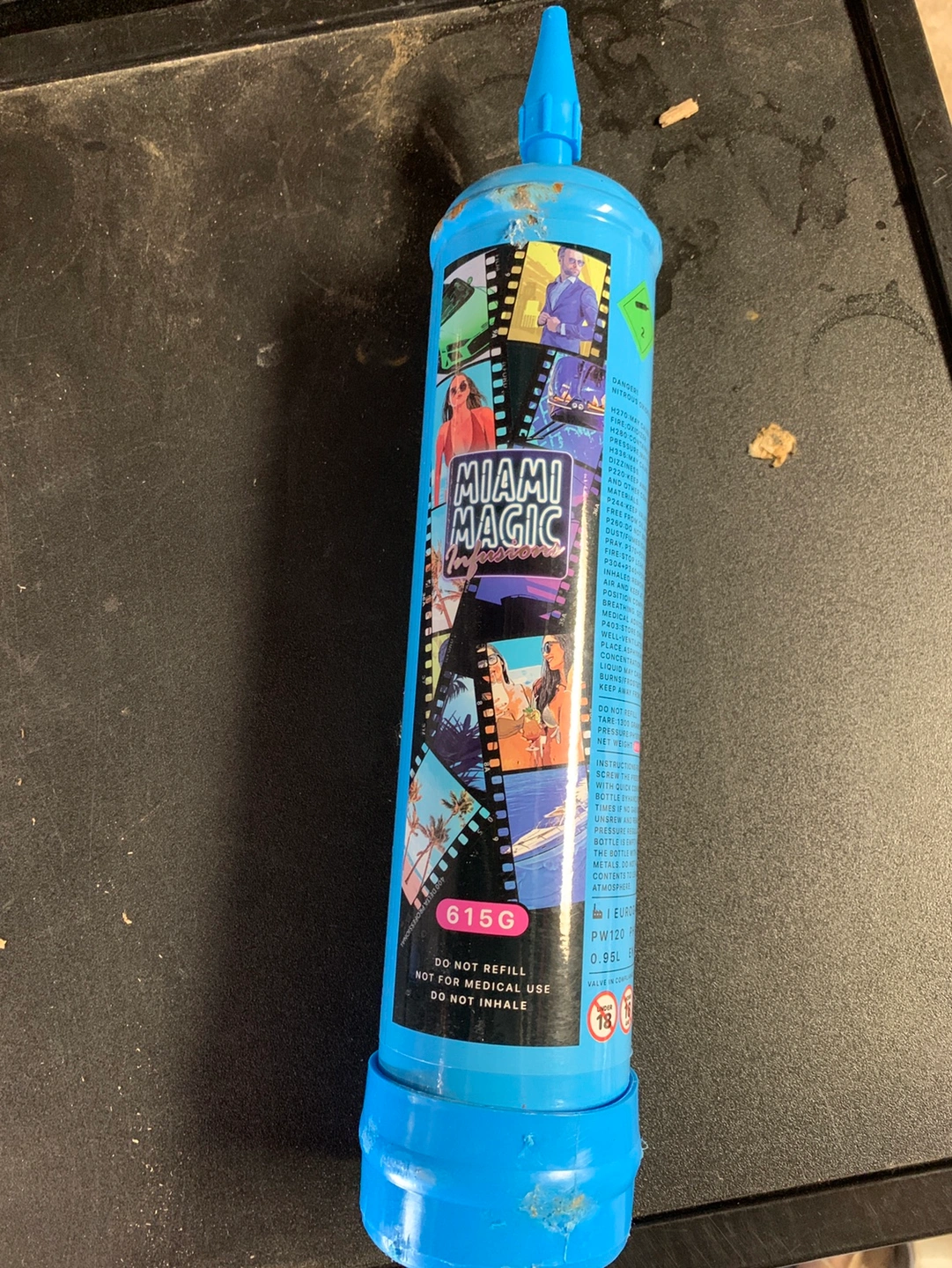73I found this canister of Miami Magic Infusion Nitrous Oxide. I was cleaning out a storage unit that I was renting out, and found this in there. The can seems a bit damaged on the outside but upon checking other does not seem to have been used.