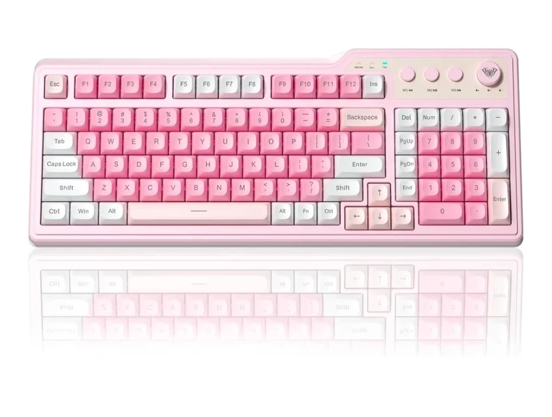 This is a pink AULA F3099 mechanical keyboard with a colorful glowing backlight that can be on or off. It includes a USB cable to charge, keyboard works wirelessly over bluetooth.