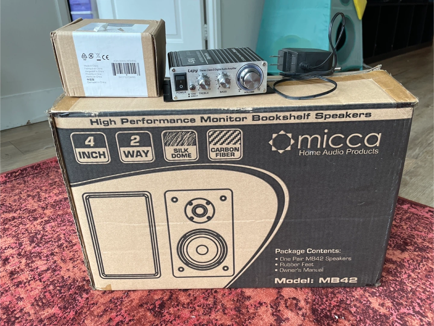 Best deal! Selling a Micca MB42 media series speakers with LP-2020A Hi-Fi stereo power digital amplifier. Speakers are customized with crossover that produces great enhanced bass and treble. Includes: - LP-2020A Amplifier - Micca MB42 Speakers - Speaker wire - Power adapter Moving out sale!