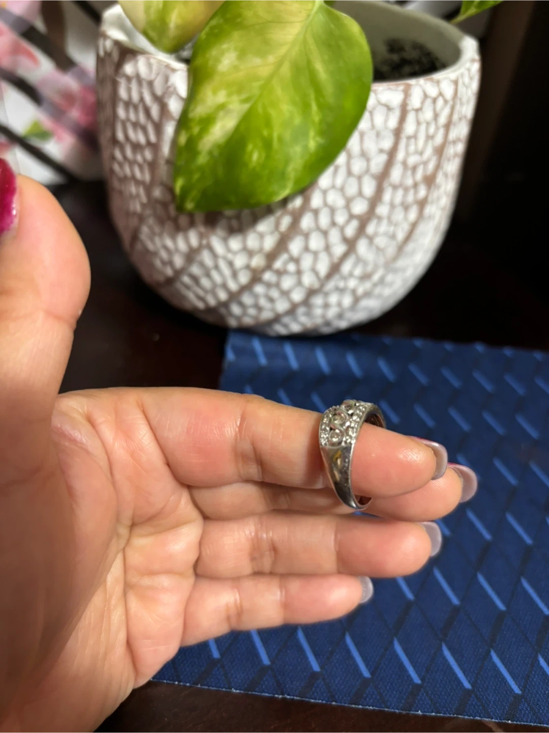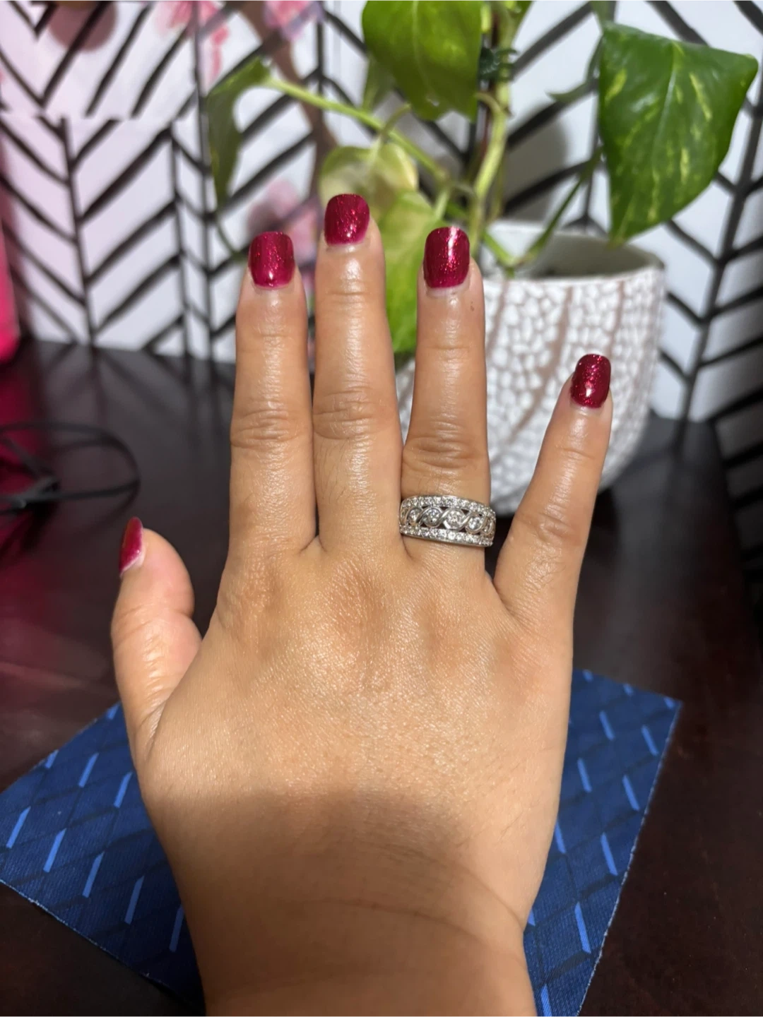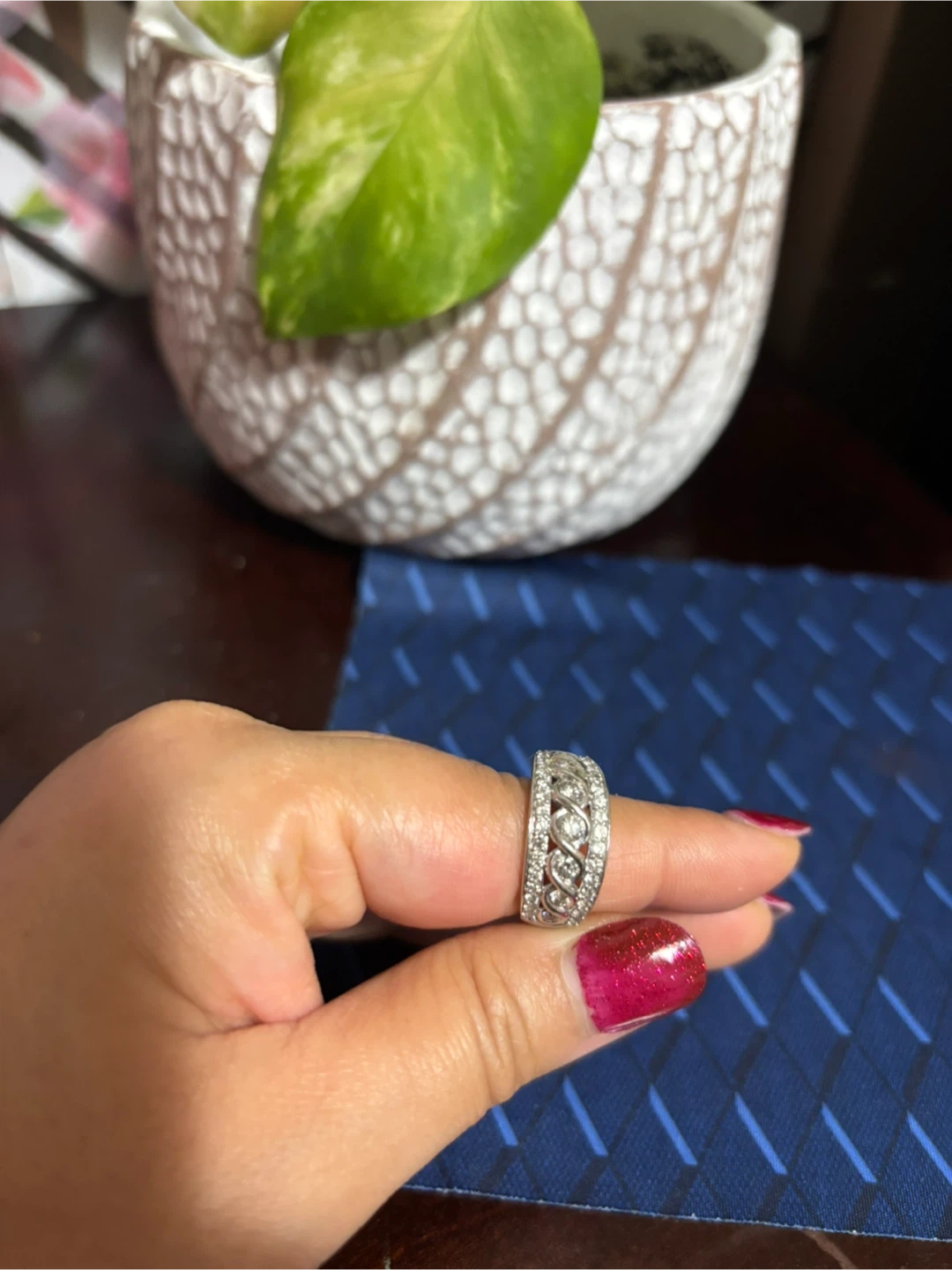 This ring features a detailed woven design with small, sparkling stones set in a silver-tone metal. It's a beautiful statement piece. The band has a substantial feel to it.