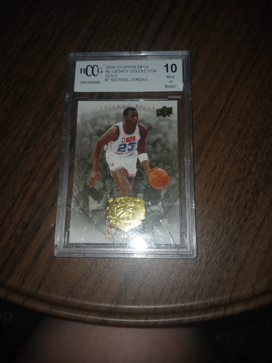 Selling a 2009-10 Upper Deck MJ Legacy Collection Gold #7 Michael Jordan card. It's graded BCCG 10, which means it's in mint condition or better. A great addition to any basketball card collection!