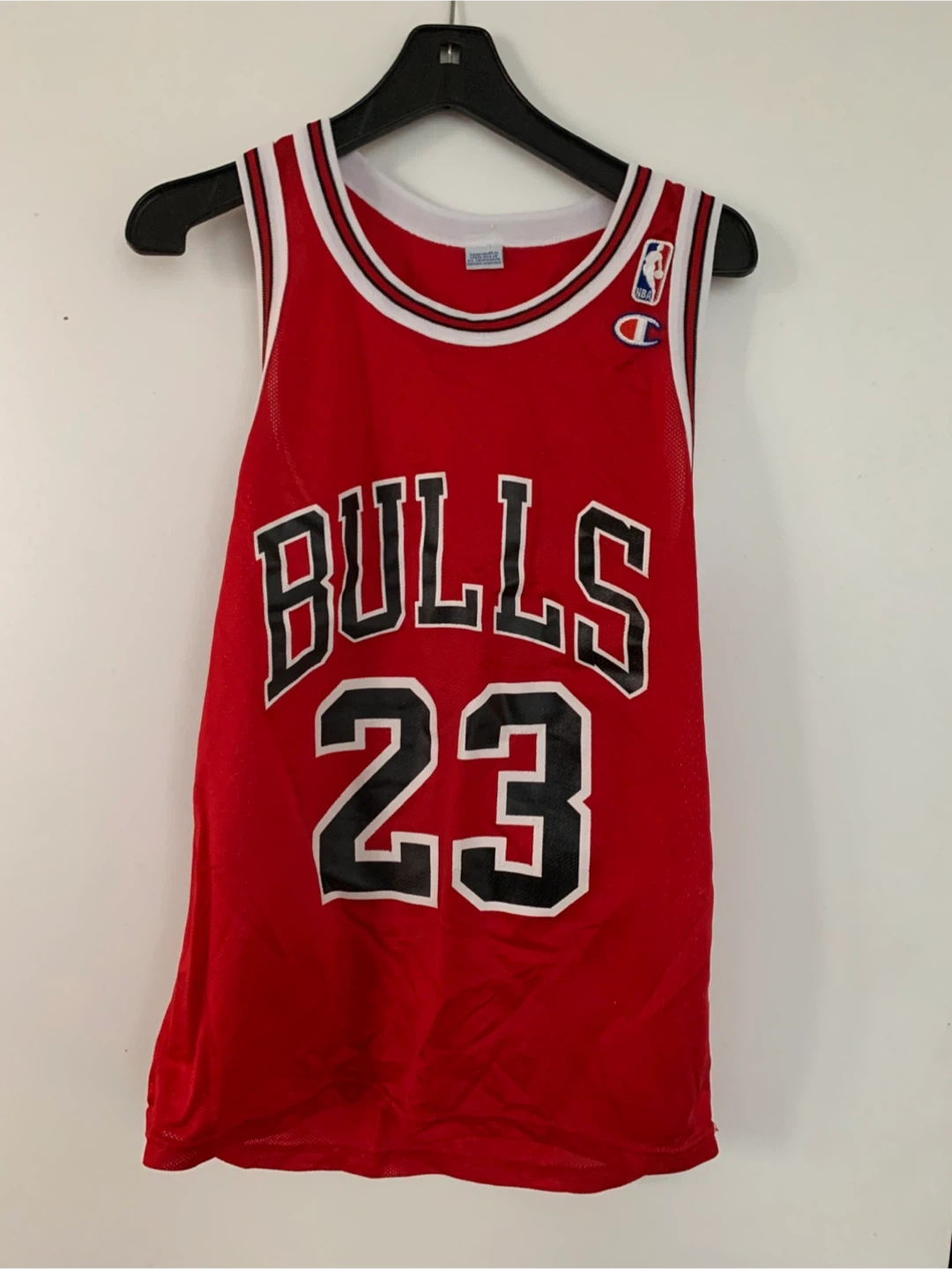77Selling a Michael Jordan #23 Bulls jersey by Champion! It's in great shape and ready for a new home. The classic red colour really pops, and it features the iconic Bulls logo and Jordan's number. Perfect for any basketball fan!