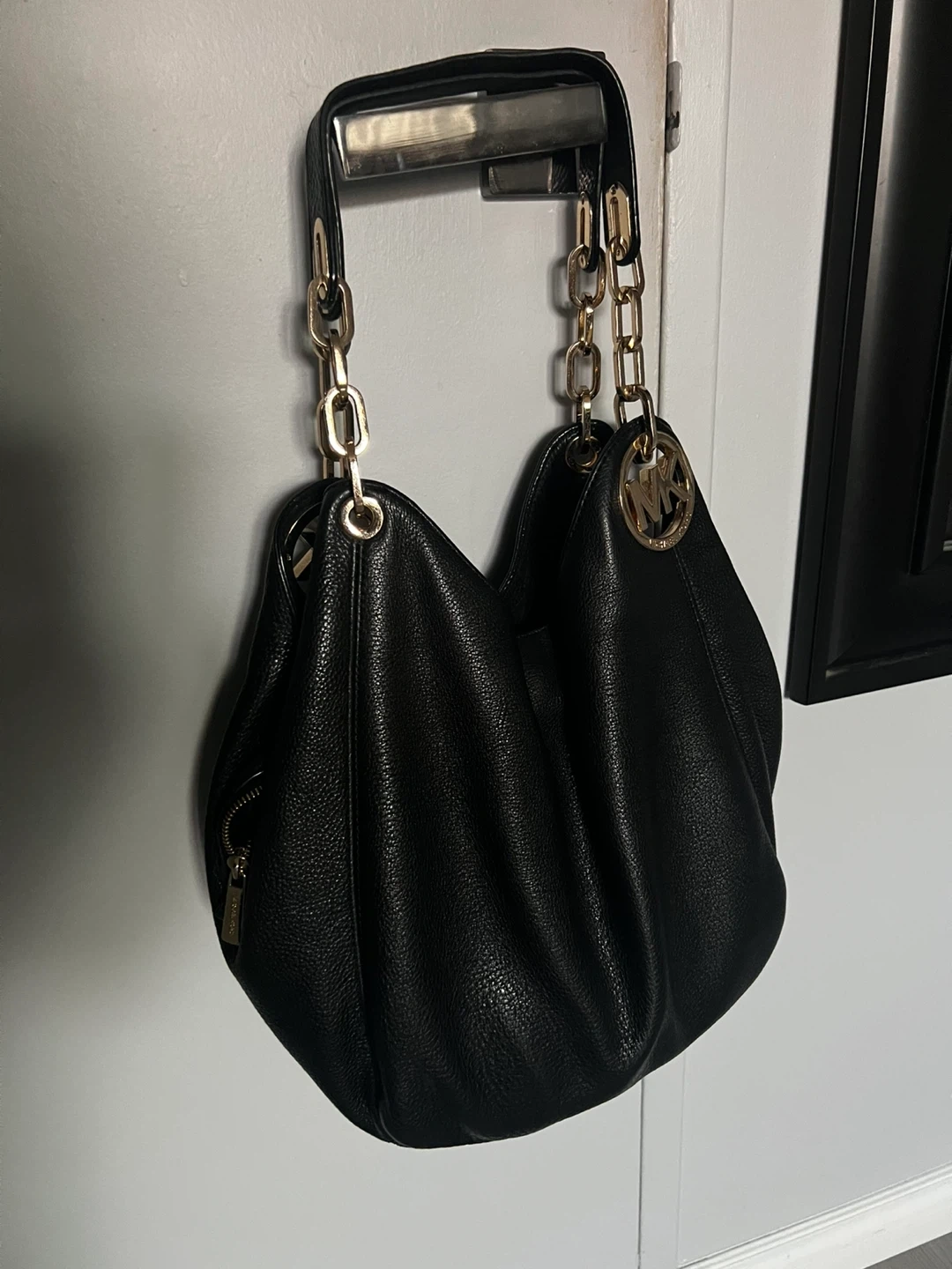 Selling a stylish Michael Kors shoulder bag in black leather. It's in great condition and features a chic chain detail. Perfect for everyday use or a night out!