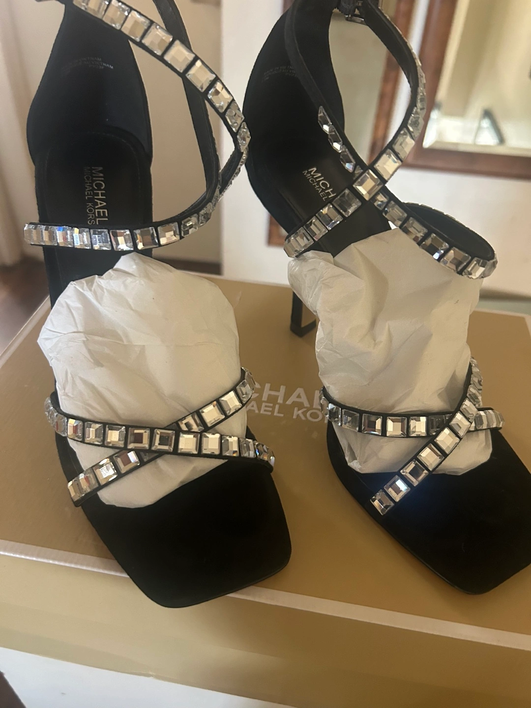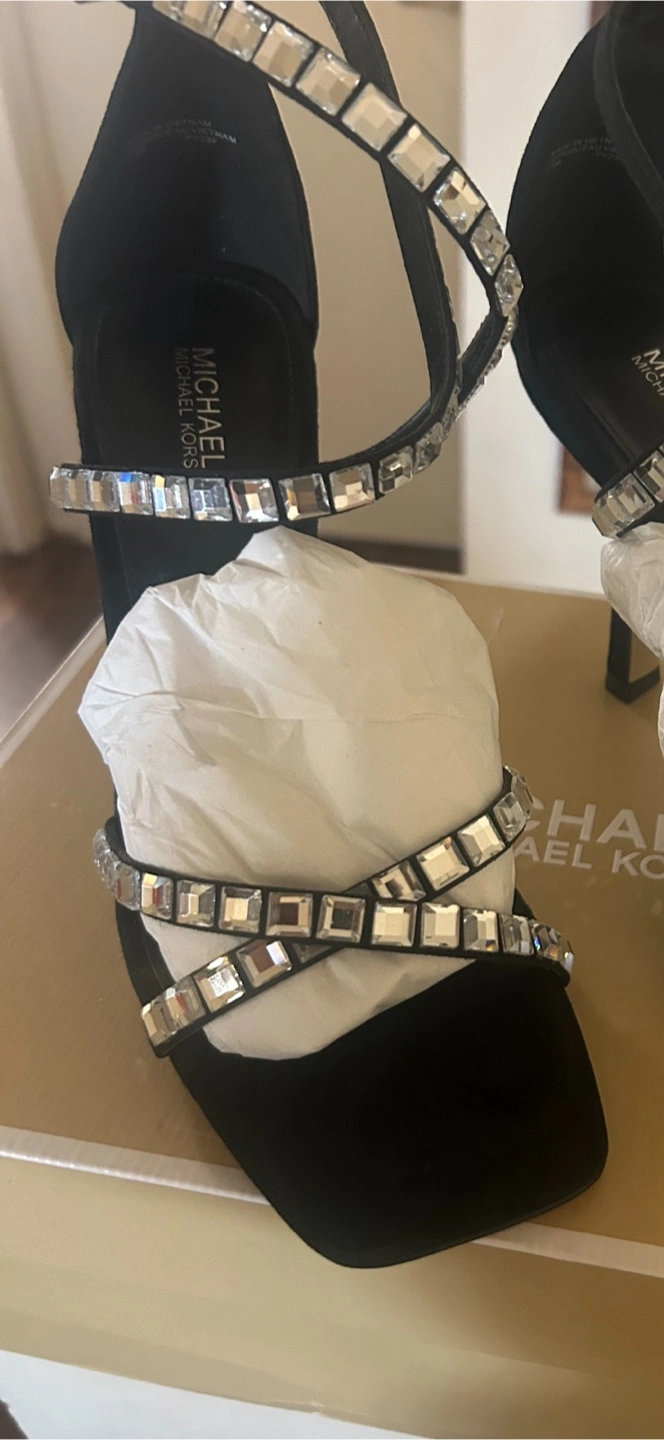 Selling a pair of Michael Kors black heels. They feature rhinestone detailing on the straps. Comes with the original box! Retail $200 Selling it for 65 Best offer