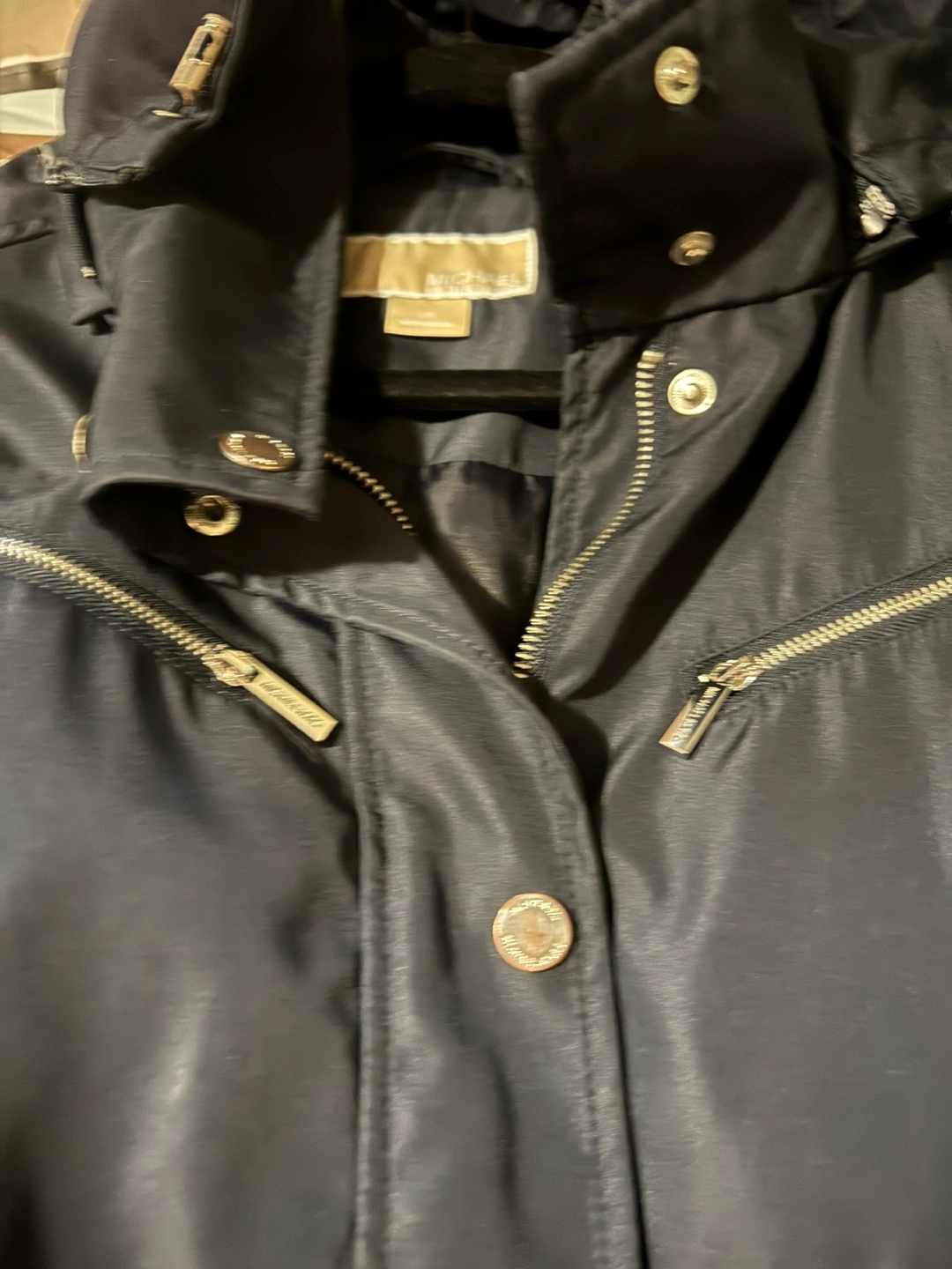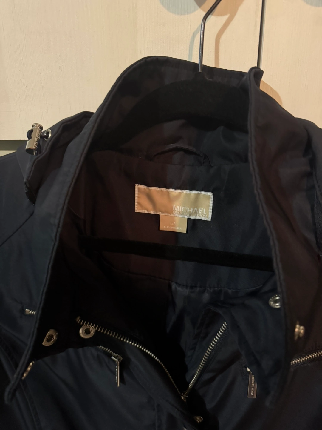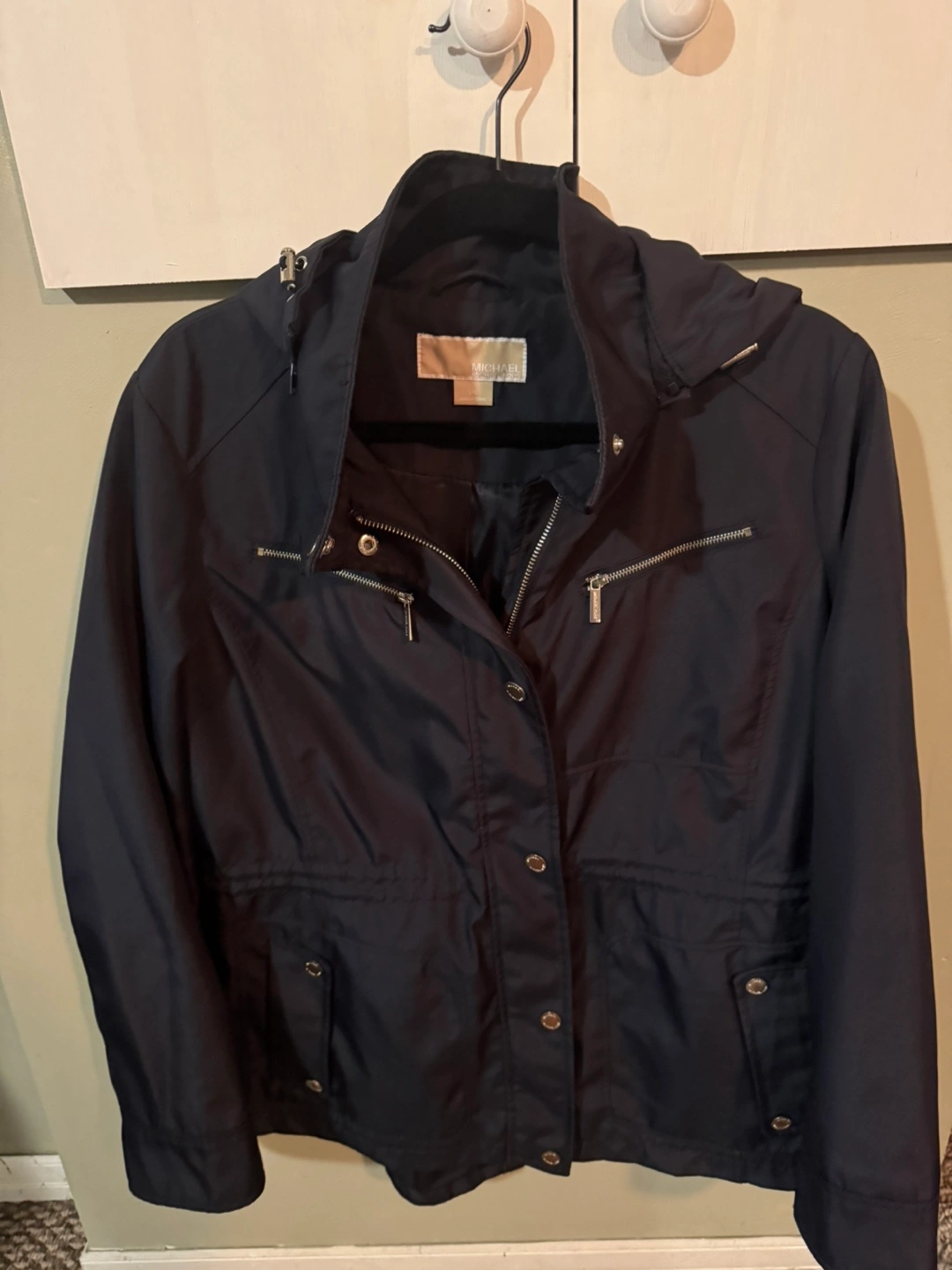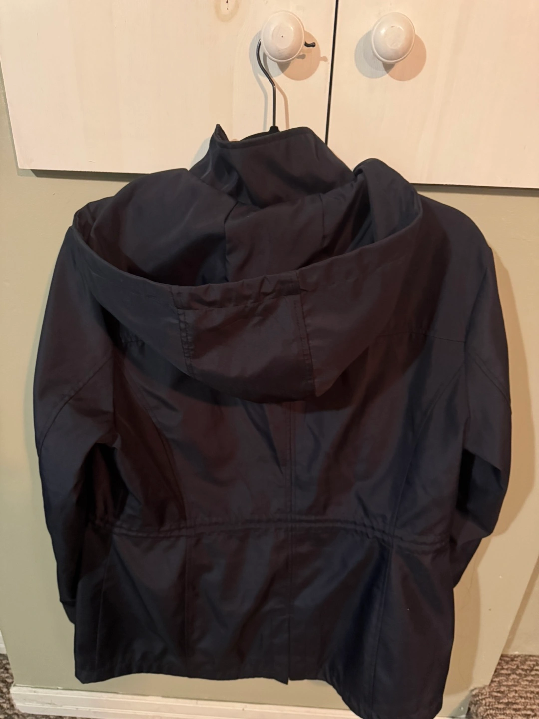 10Black hooded jacket. Zipper and button closure. Two zippered pockets on the front. Drawstring waist.