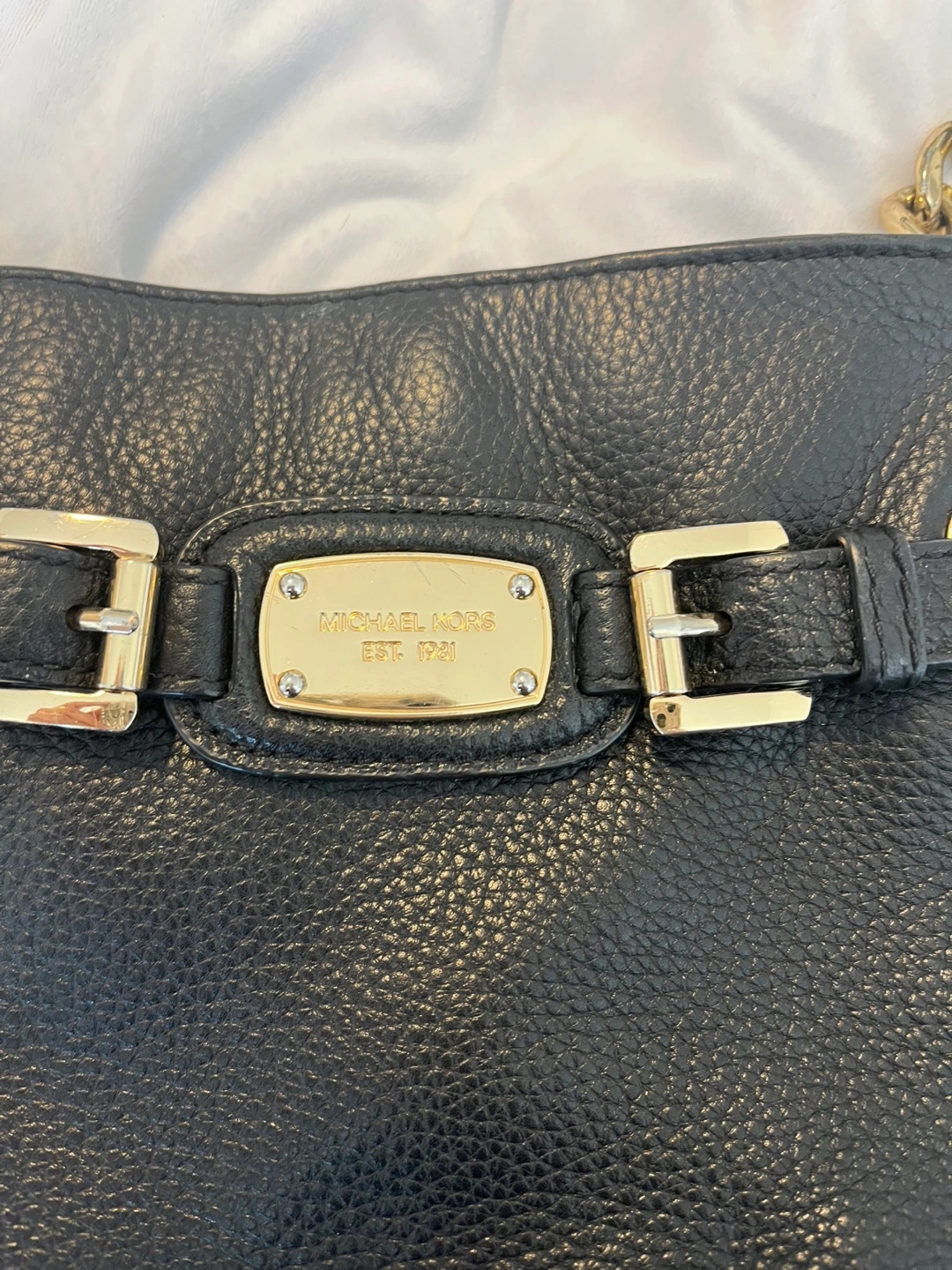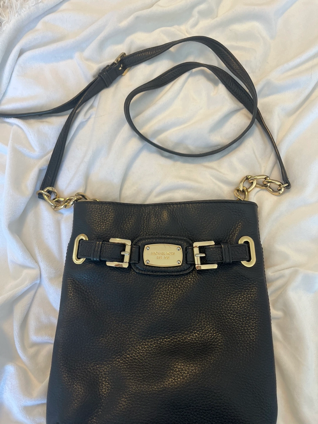 This is a gently used Michael Kors crossbody bag in black leather. It's in great shape and ready for a new home! It features a chain detail on the strap and buckle detailing on the front.