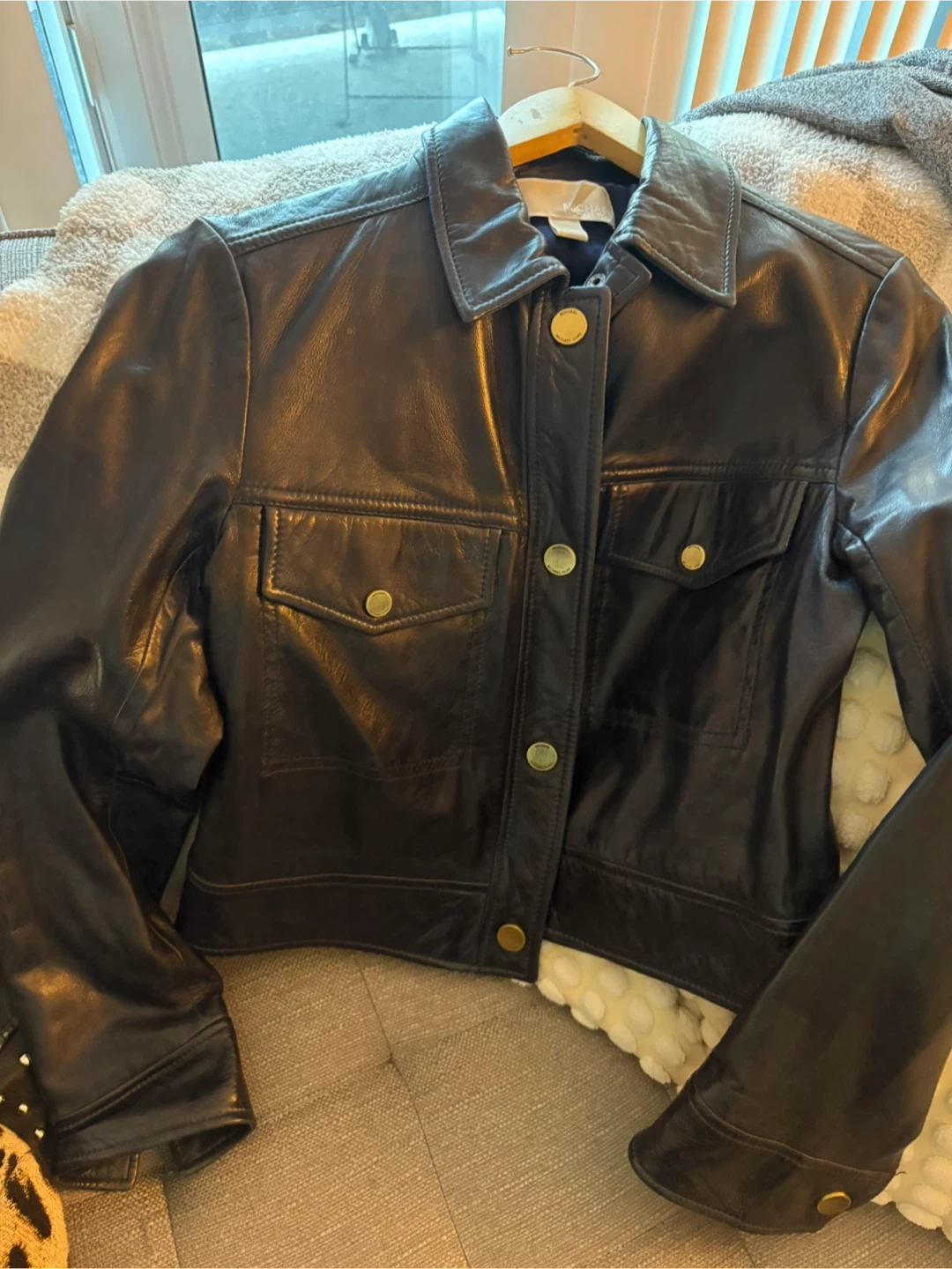 15Selling a stylish navy Blue leather jacket from Michael Kors. It features a classic design with front pockets and button-up closure. Perfect for adding a touch of sophistication to any outfit!