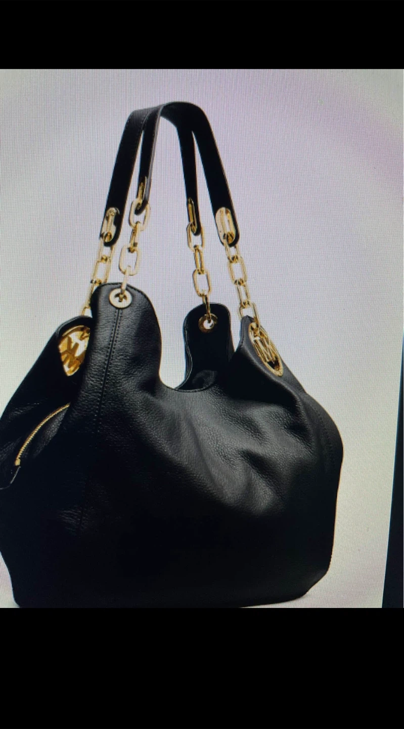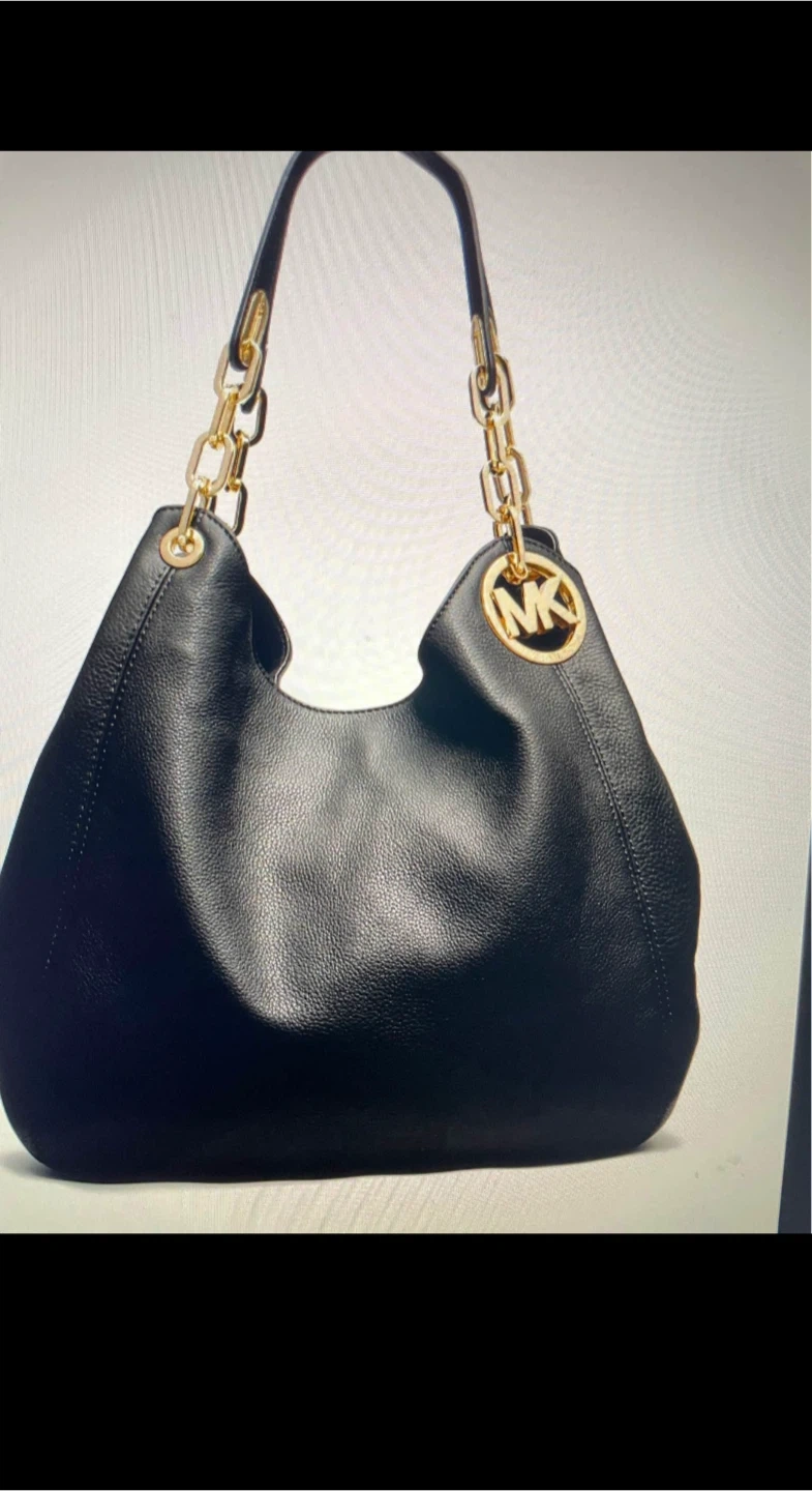 This is a beautiful Michael Kors shoulder bag in black leather. It features gold-tone chain detailing on the straps and the signature MK logo. It's in great condition and ready for a new home!