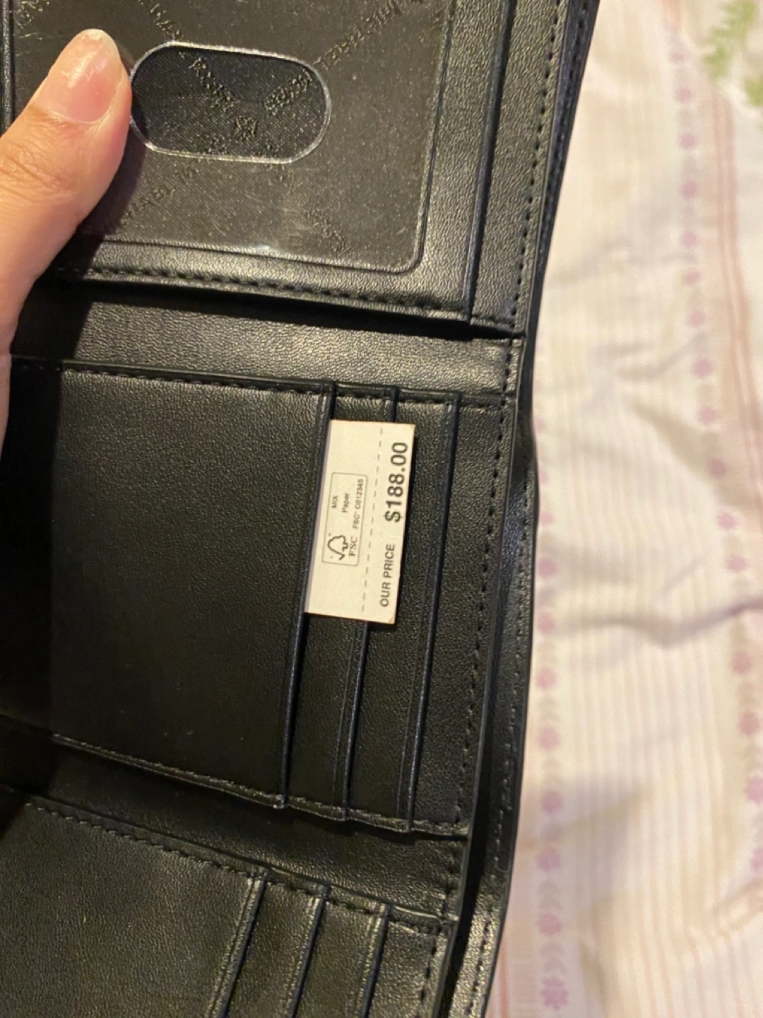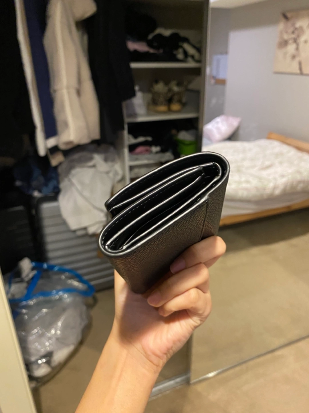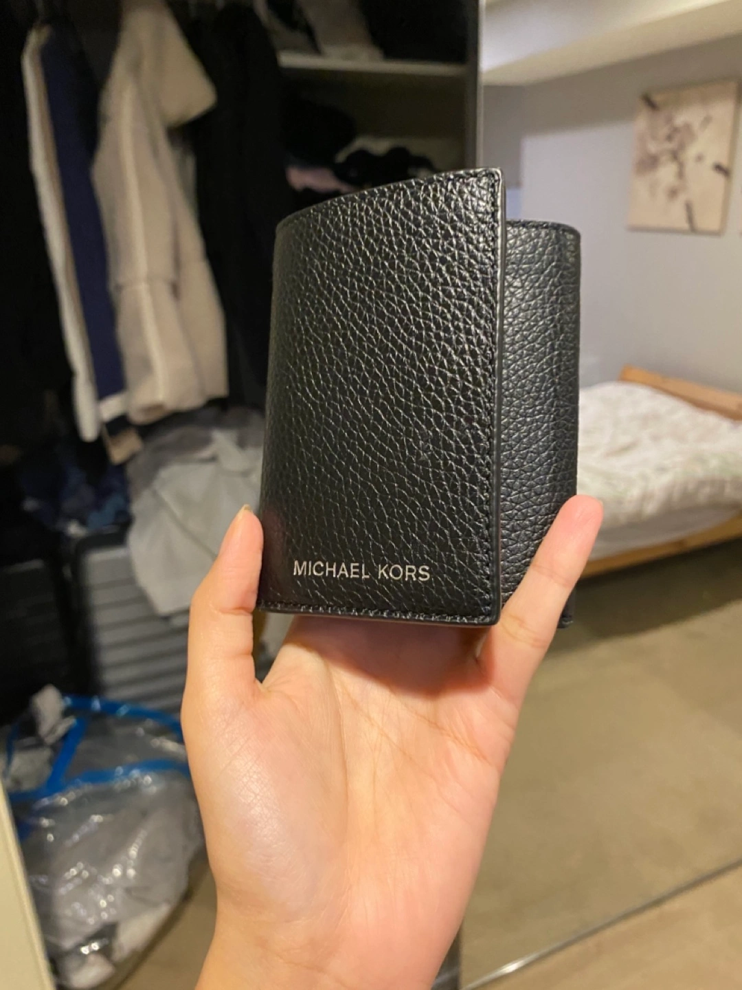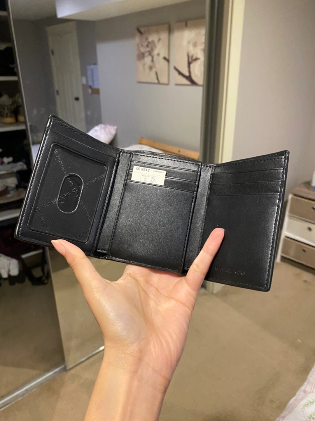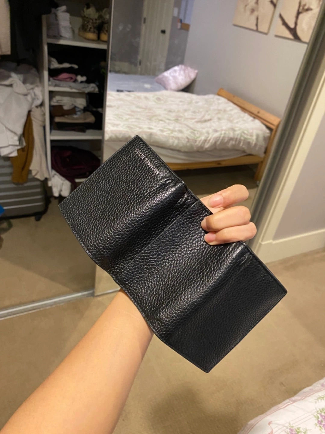 10Compact trifold wallet. Black pebbled leather. Multiple card slots and bill compartment. Minimalist design. Gently used.