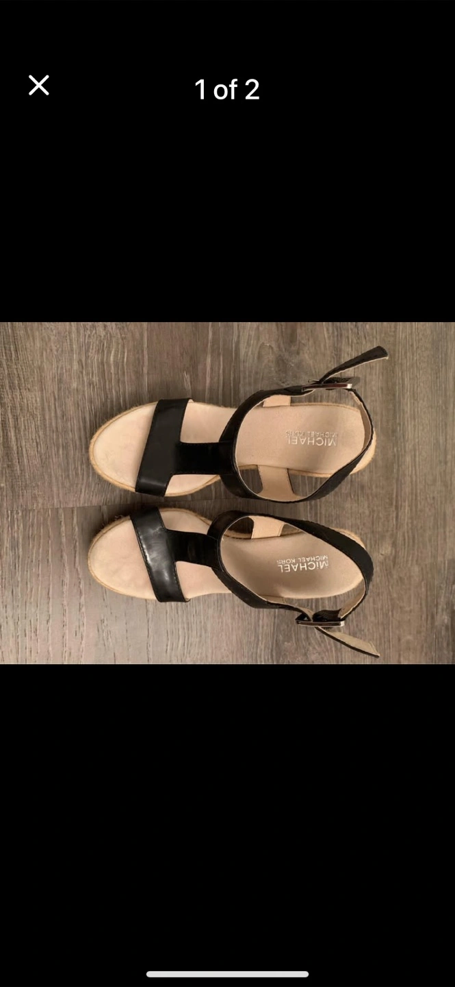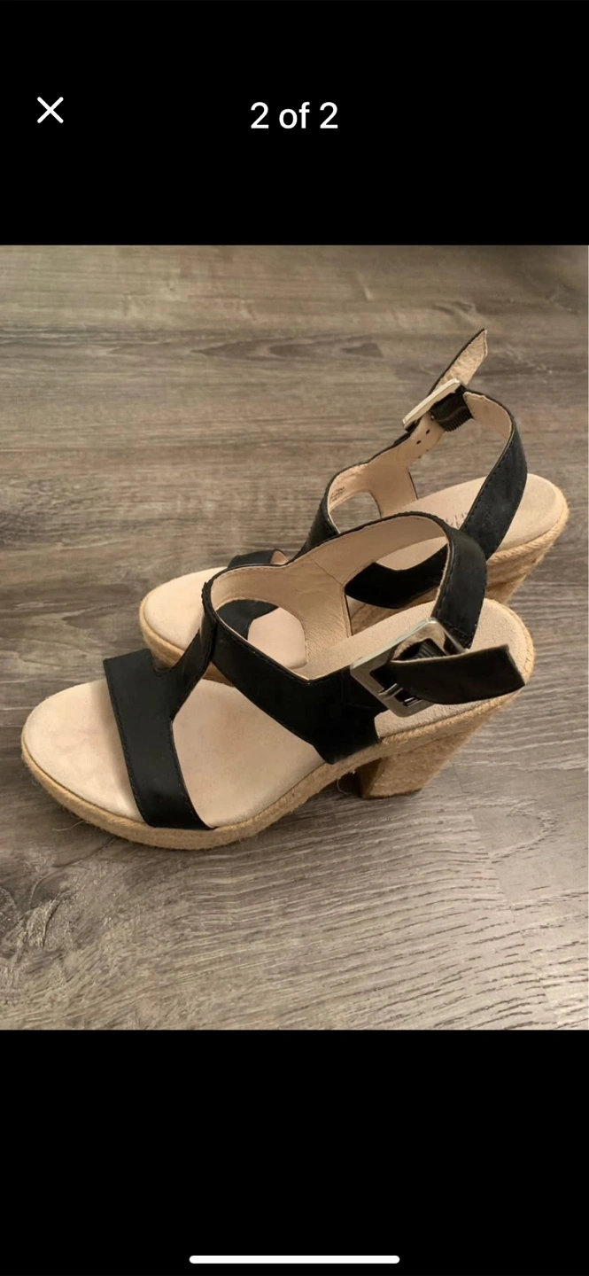 65Black leather sandals. Wedge heel. Adjustable buckle closure. Size 7