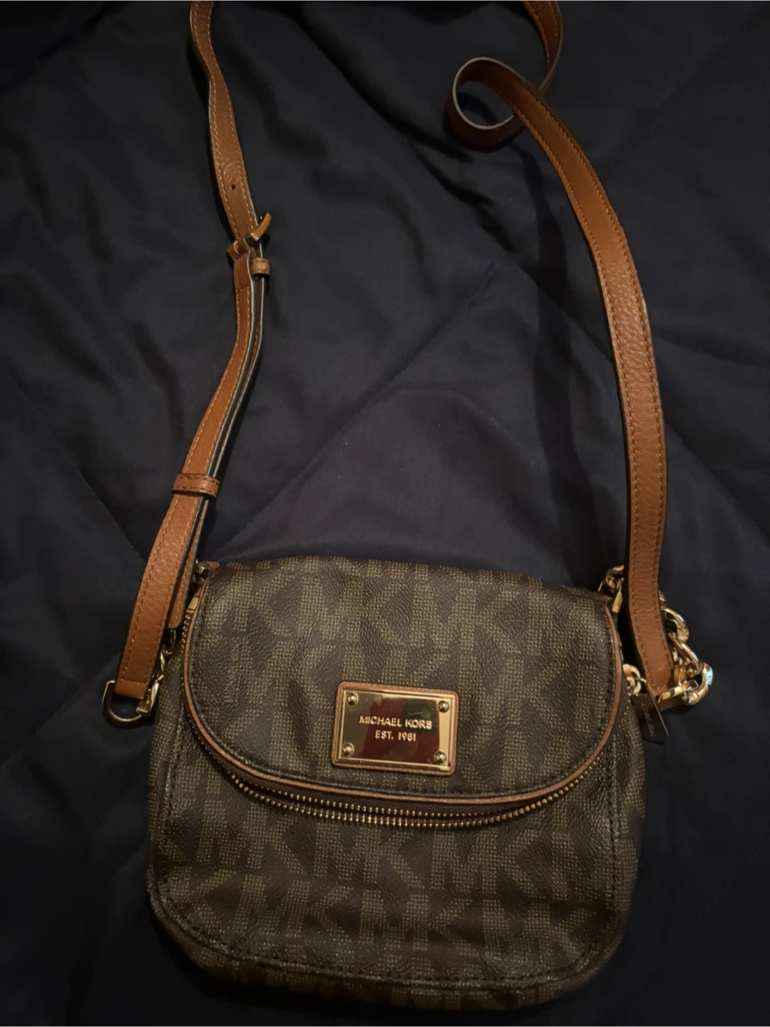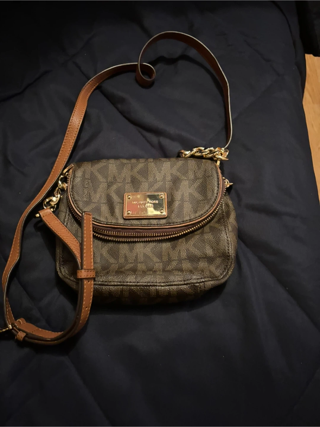 176Selling a gently used Michael Kors crossbody bag! It's in great condition and has a stylish brown colour with the MK logo pattern. Perfect for everyday use or a night out