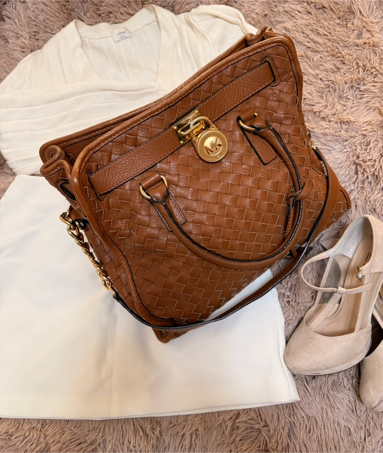 97Selling a stylish Michael Kors handbag in a brown/ camel leather! It features a woven design and gold-tone hardware. This pre-loved bag in a great condition; although has some life marks (scuffing). It's perfect for adding a touch of elegance to any outfit.