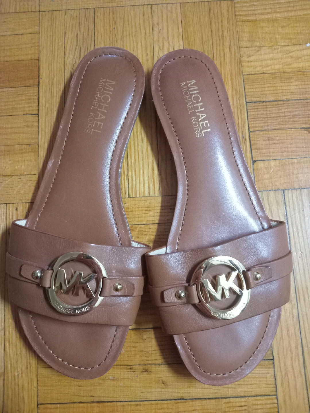 Cute Michael Kors brown leather slides! They are in great condition and feature the MK logo on the front. Perfect for a casual day out or dressing up a bit