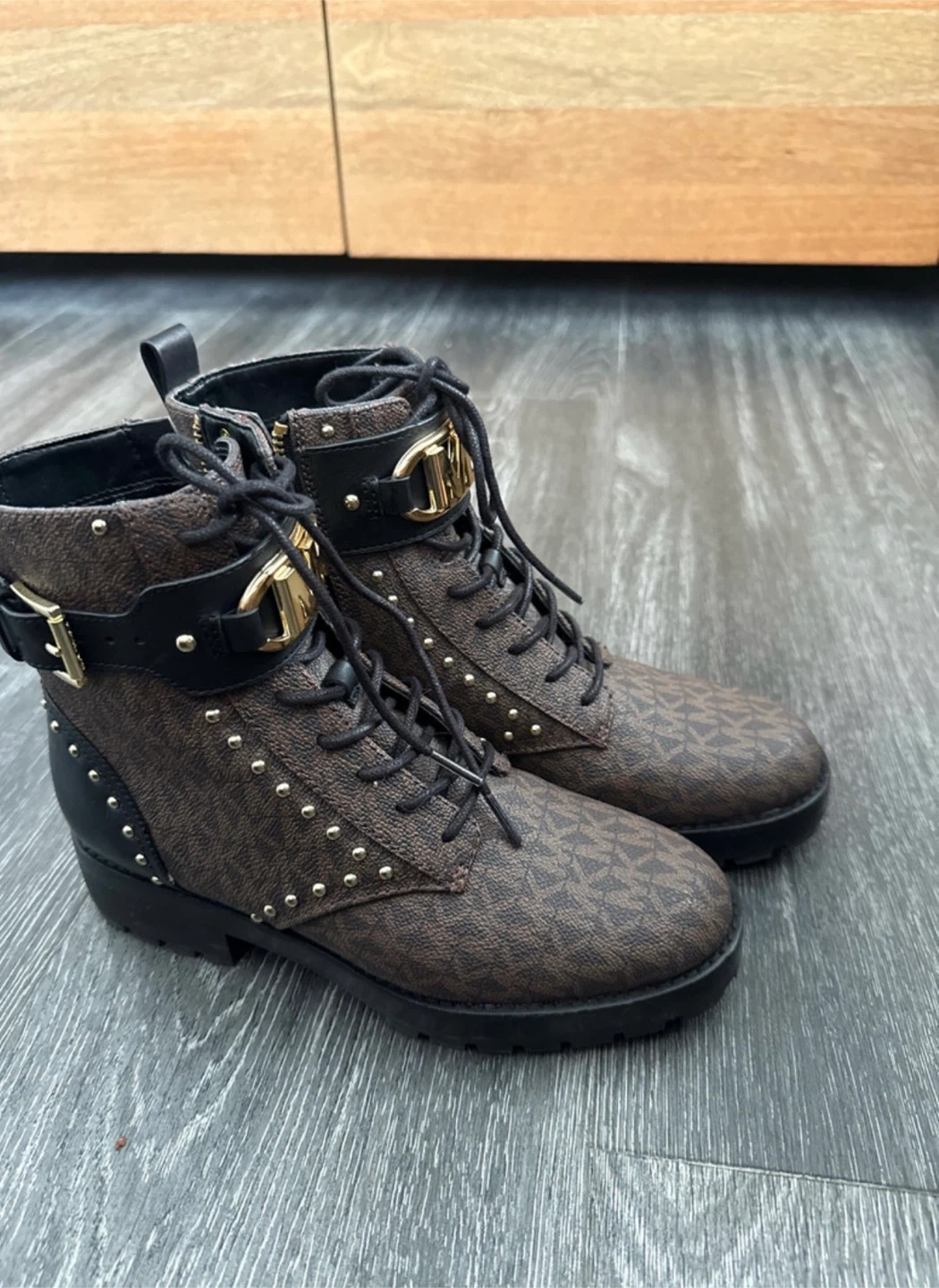 Step out in style with these Michael Kors boots, featuring a chic monogram pattern and gold-tone hardware. Good used condition, size US 6M—stylish, comfy, and perfect for Toronto winters. ✨ Features: • Monogram design • Lace-up closure • Gold-tone buckle & studs • Durable rubber sole $100 — a steal compared to retail. If the ad is up, they’re still available!