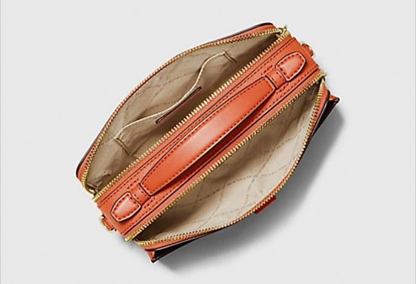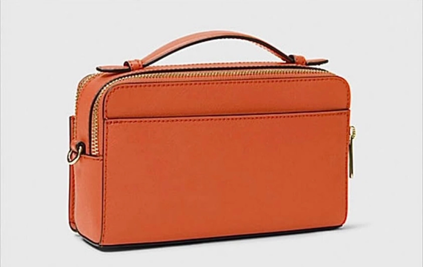 Stylish burnt orange crossbody bag. Features a top handle and a detachable shoulder strap. Multiple compartments for organization. Gold-tone hardware. Perfect for everyday use.