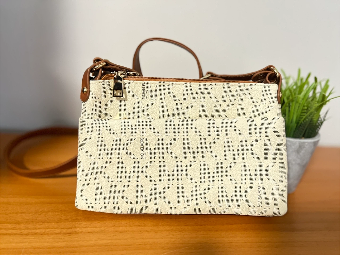 Selling a Michael Kors crossbody bag in a lovely cream and brown colour combination. It's in great condition and perfect for everyday use! The bag features the MK logo pattern and has a convenient size for carrying your essentials. It has a zipper closure and an adjustable shoulder strap.