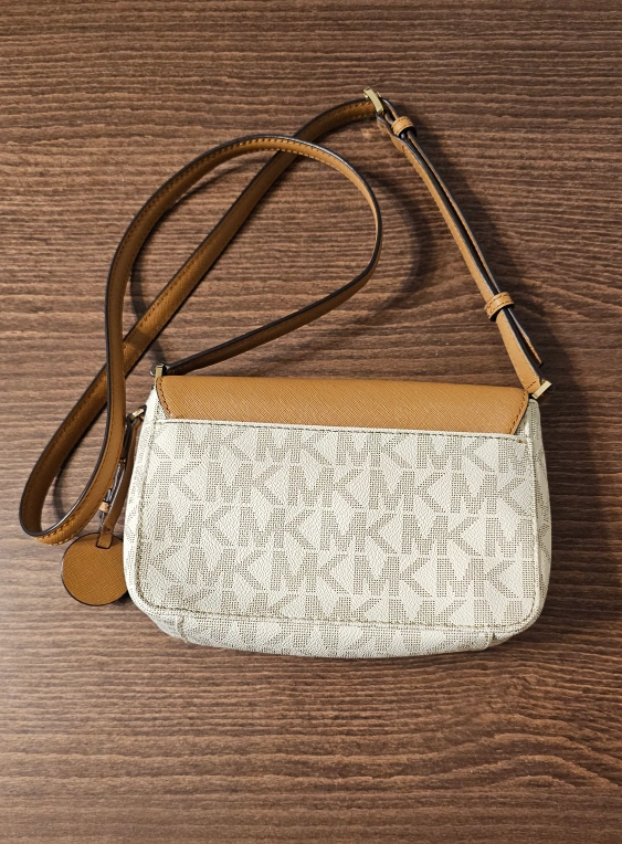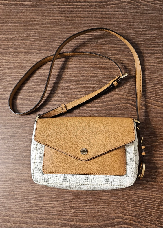 Selling a Michael Kors crossbody bag in a lovely beige and brown colour combination. It's in great shape and perfect for carrying your essentials while keeping your hands free! The bag features the classic MK logo pattern and has a stylish, compact design