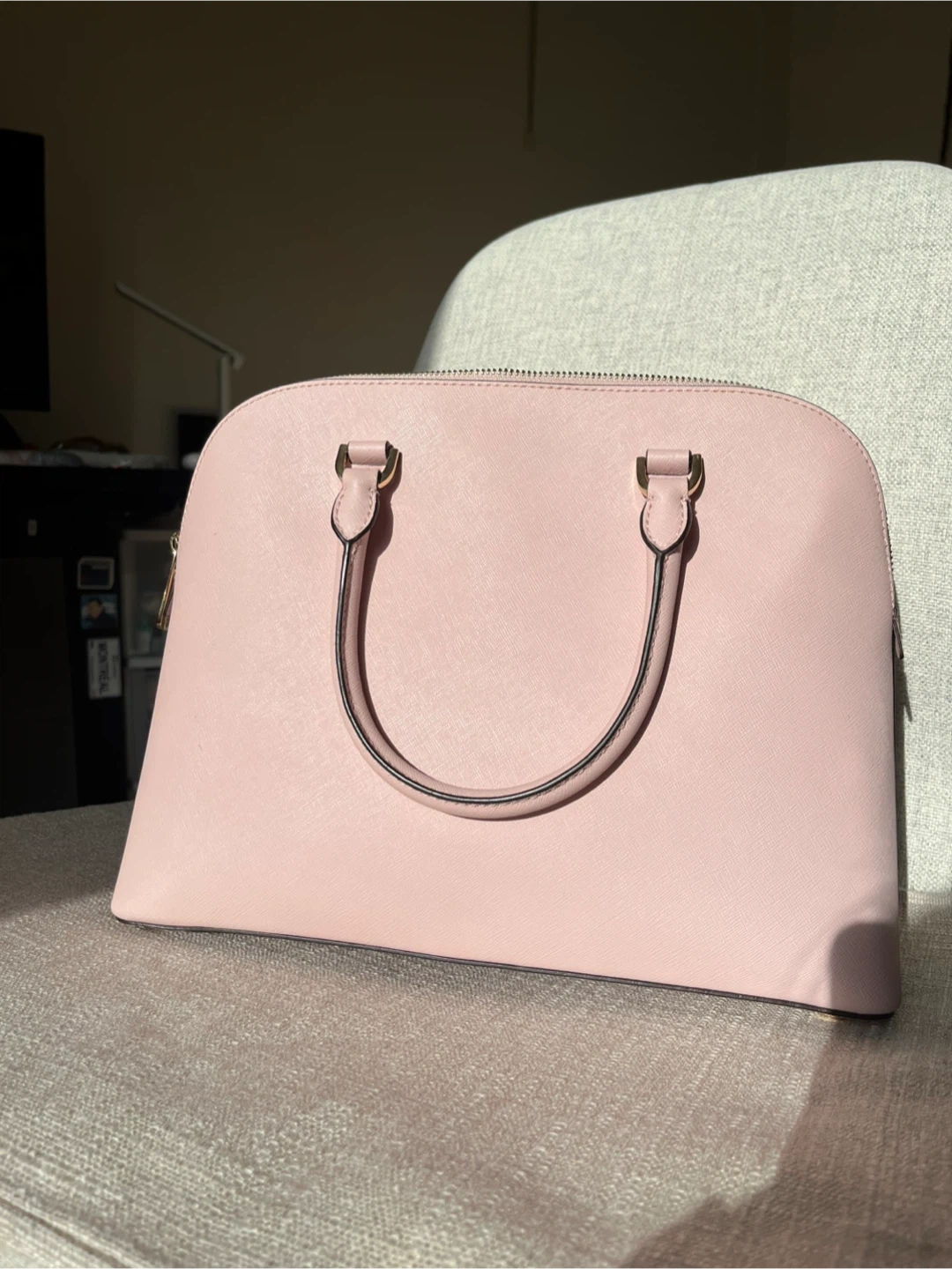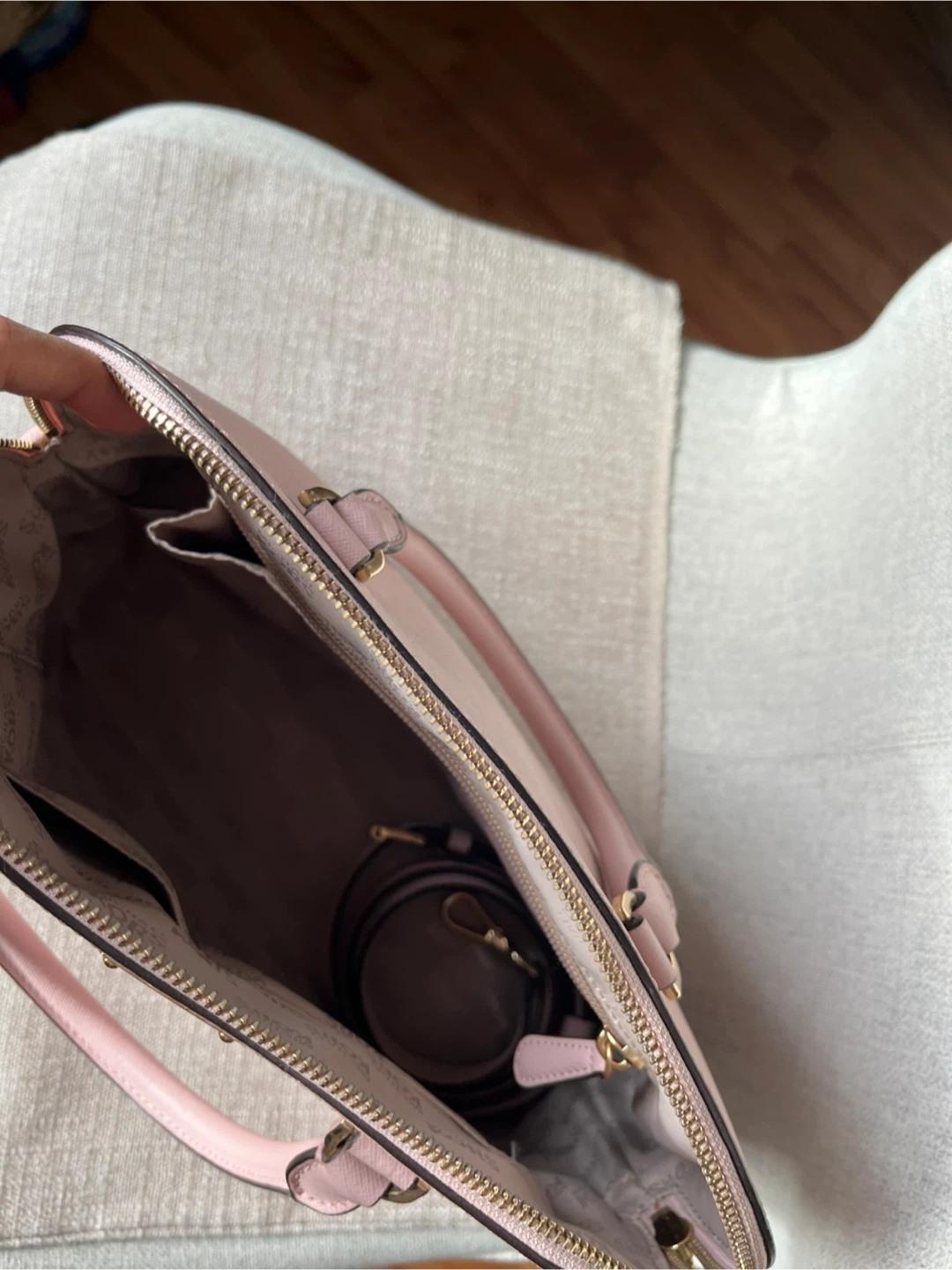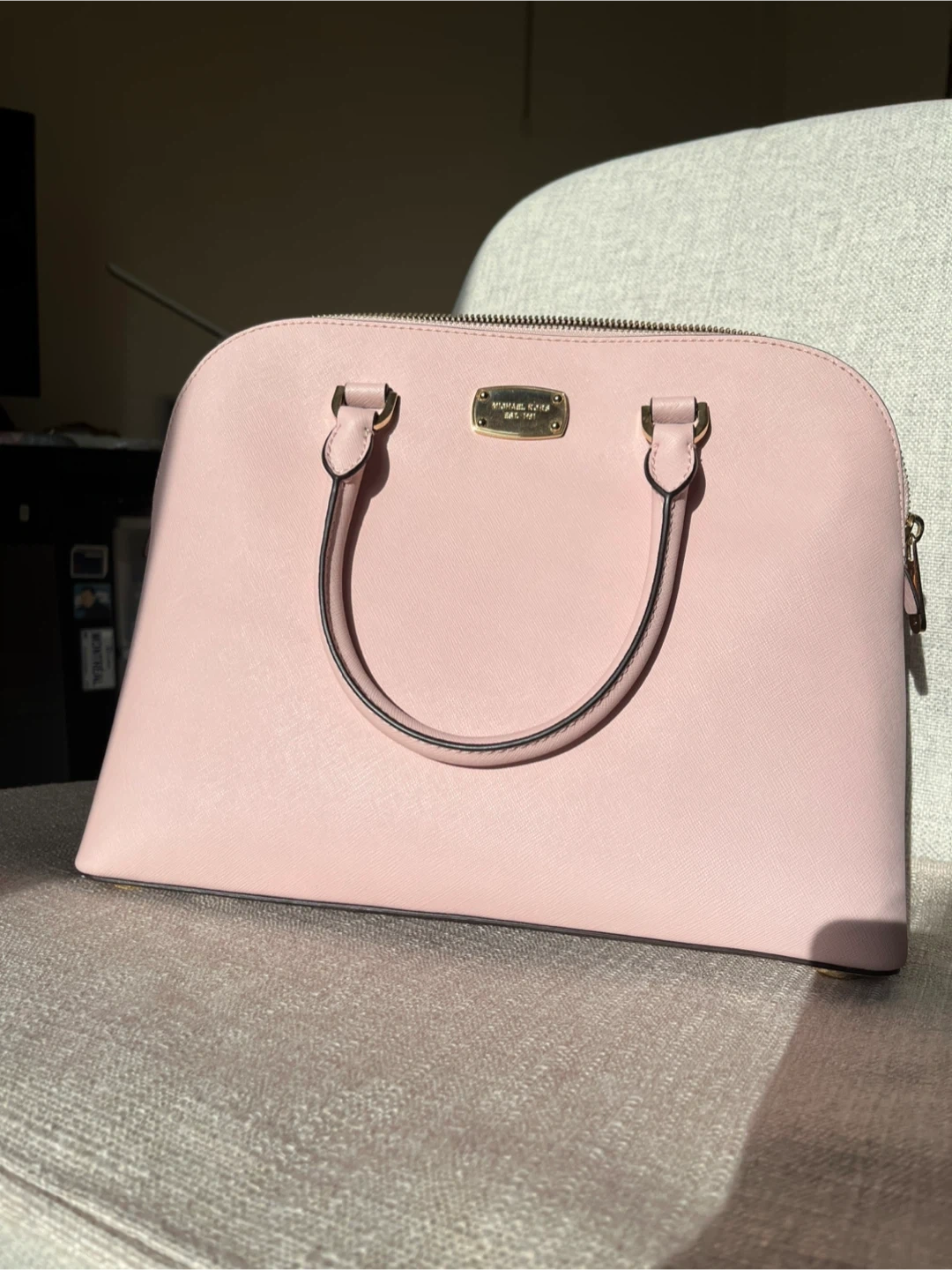 17Selling a lovely Michael Kors dome satchel in a cute light pink colour. It's in great condition and perfect for everyday use or a special occasion. The bag has a classic design and is made from high-quality materials. It's a stylish and functional accessory to add to your collection Comes with shoulder stripe Length 30cm, height 23cm, width 12.5cm Like NEW, no scratches, carefully stored