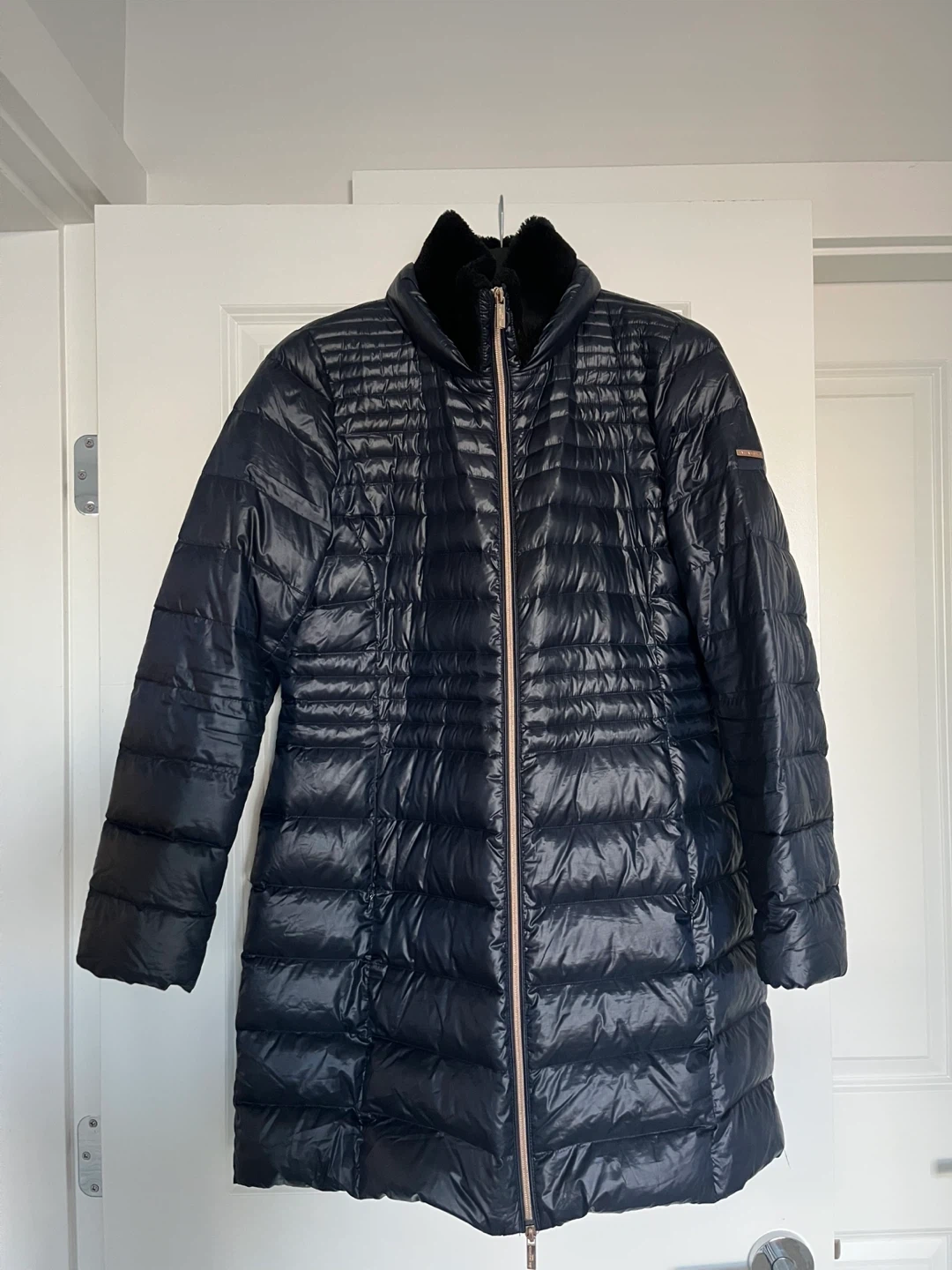 25Selling a Michael Kors down puffer coat in a dark navy colour. It has a faux fur collar and a zip closure. There is a small tear on the sleeve as pictured.