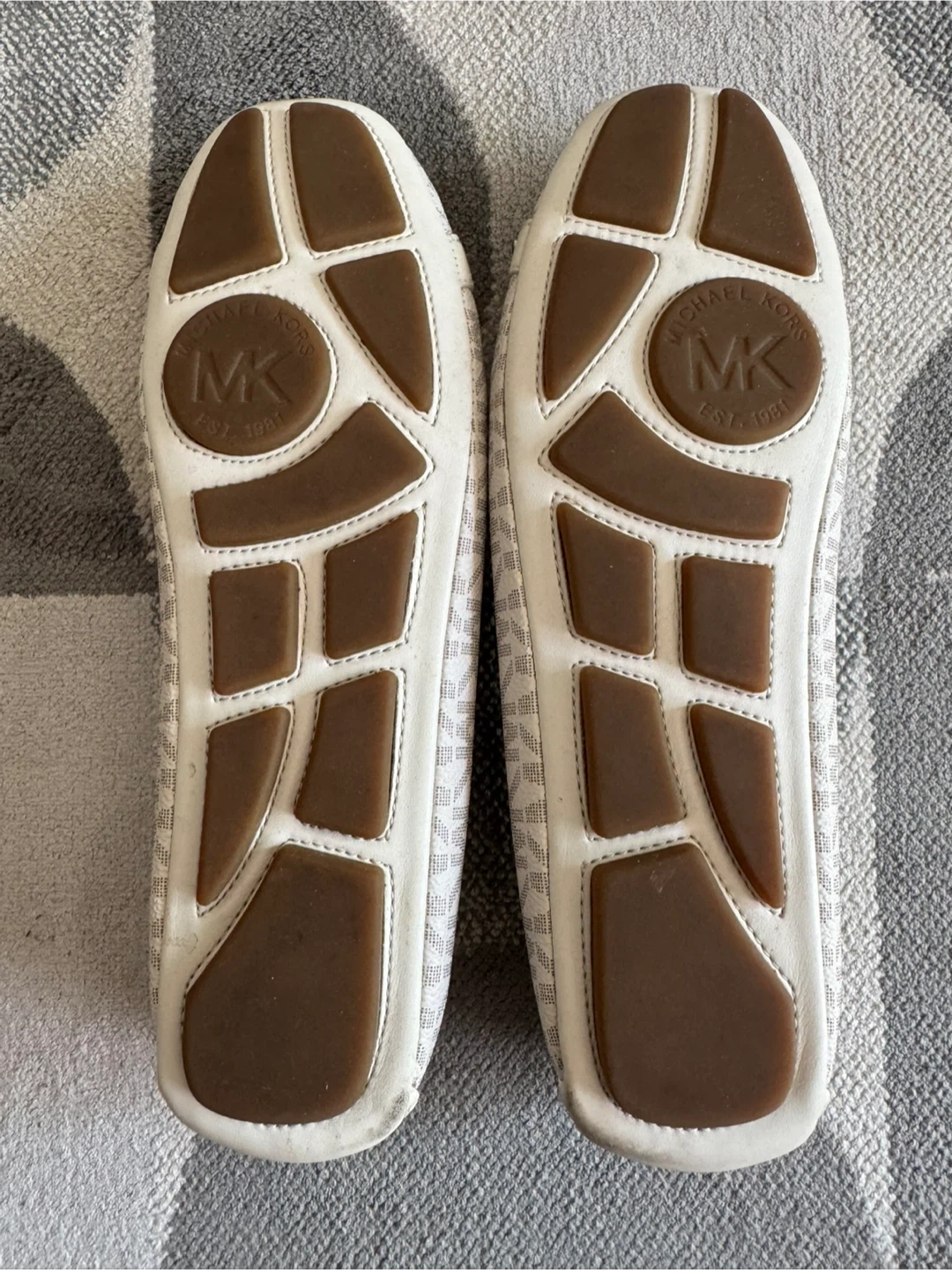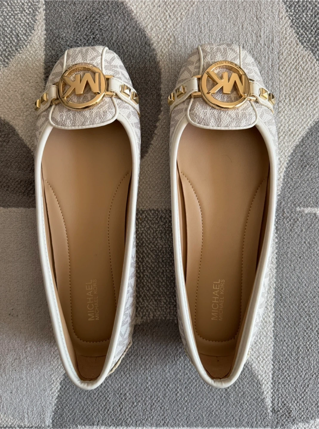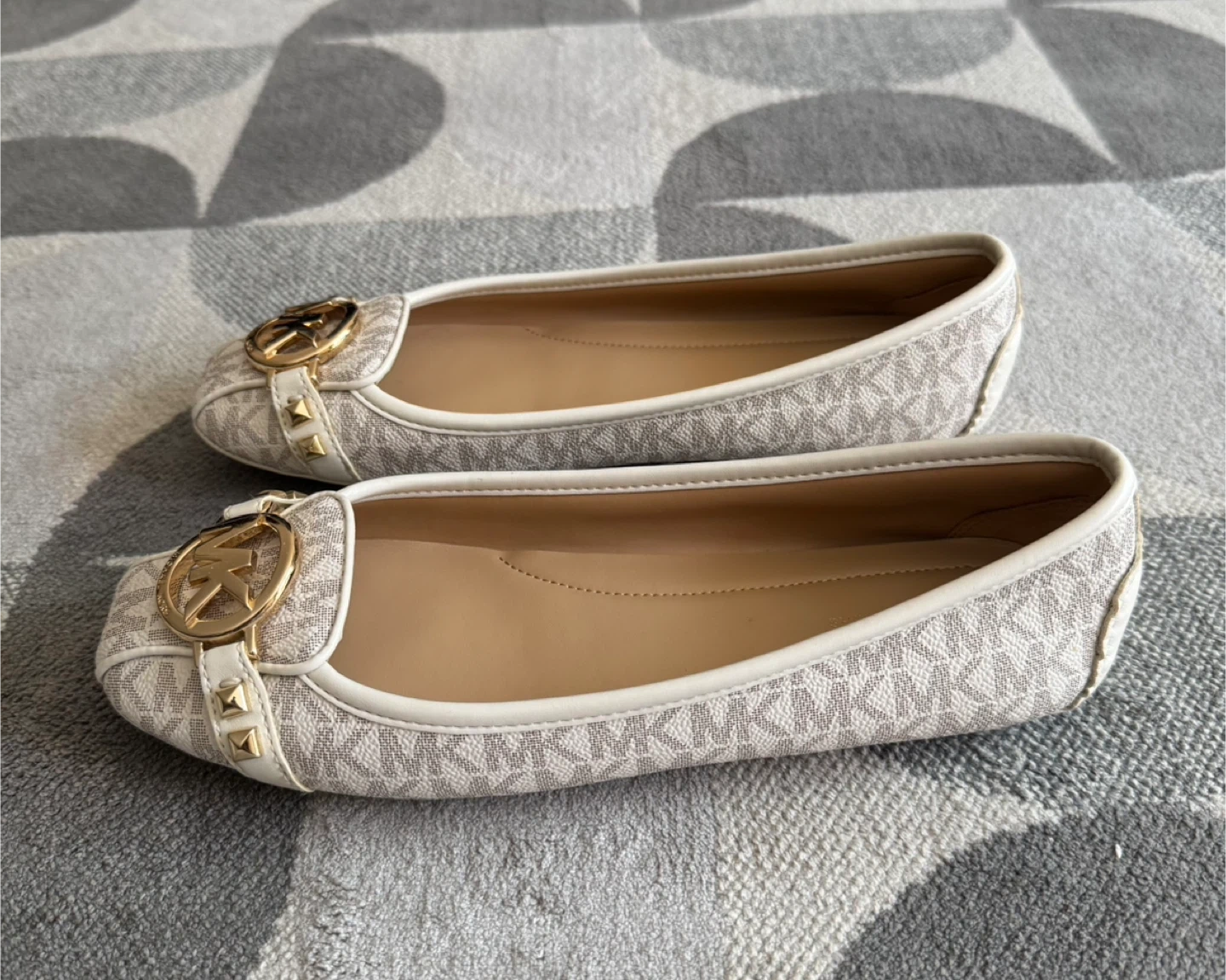 Selling a pair of Michael Kors flats in size 8. They feature the MK logo pattern and gold-tone hardware. Great for everyday wear!