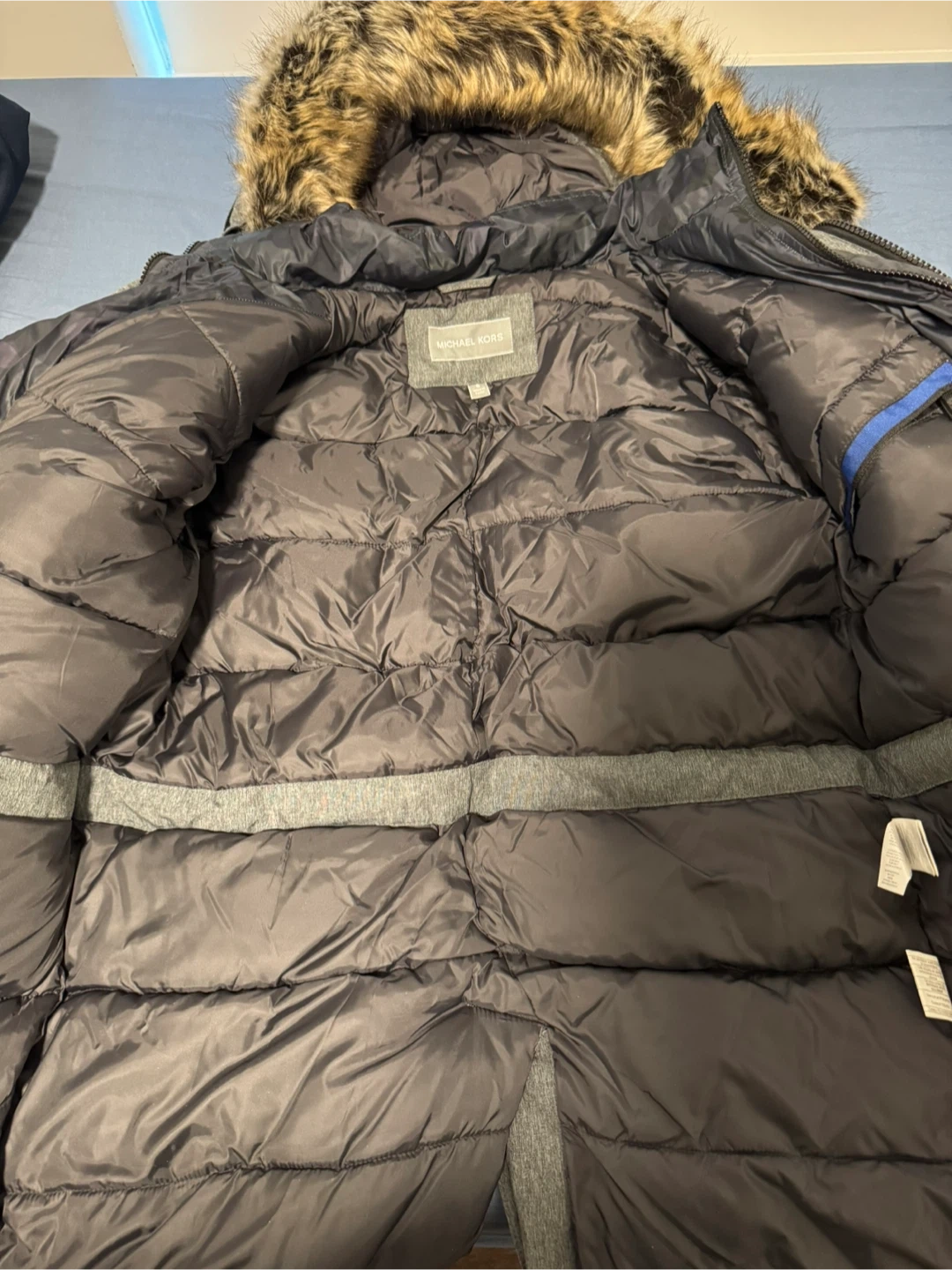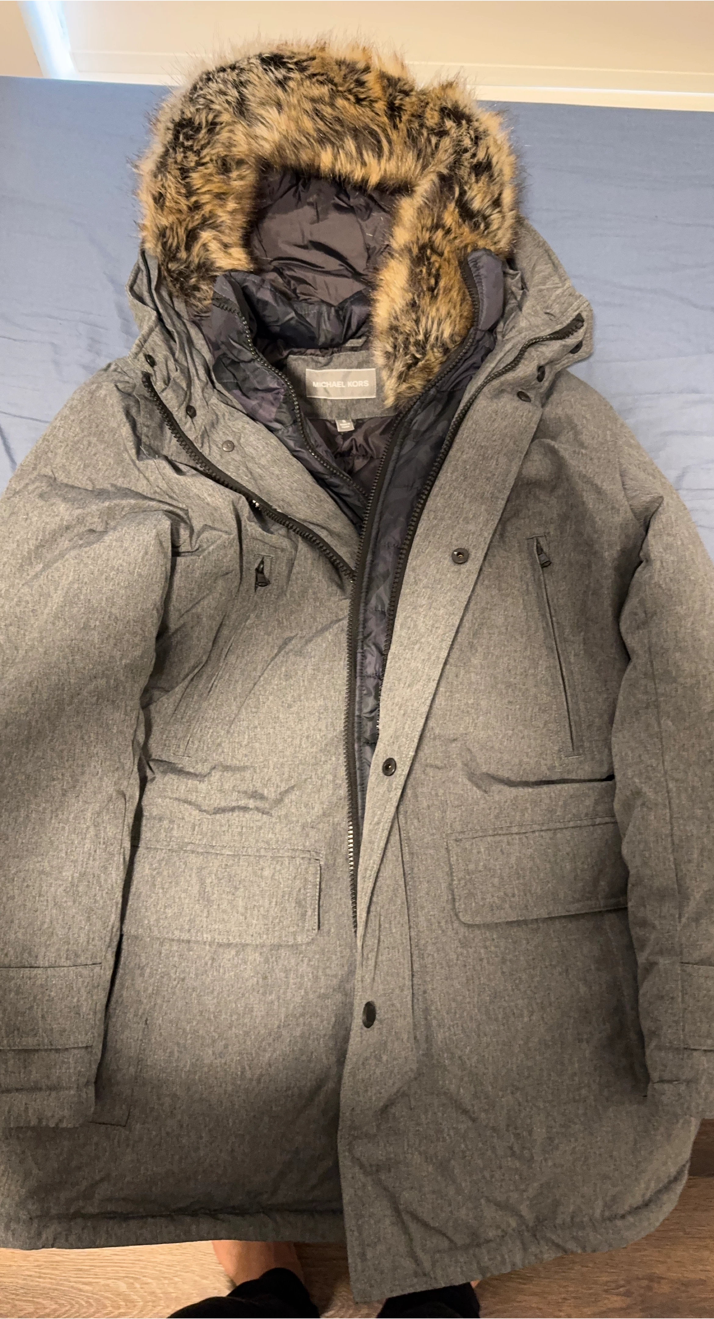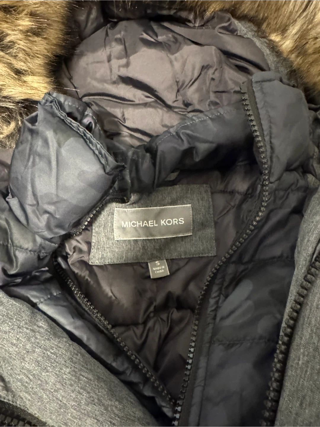 68Selling a Michael Kors winter parka in grey. It's a size small and features a fur-trimmed hood for extra warmth. Great for Canadian winters!