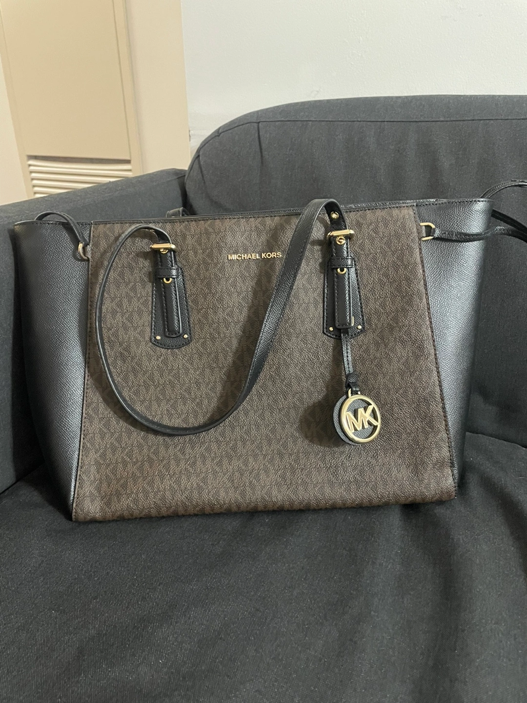 13Original bag. Brown and black. Monogrammed design. Gold hardware.
