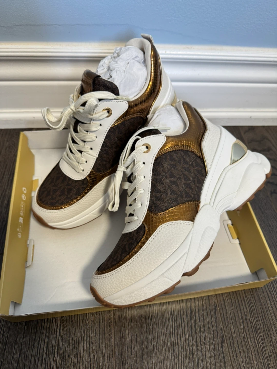 15Selling a pair of Michael Kors Katrina Wedge Trainers! These are a size US 7.5 and come in a brown multi colour. The shoes are in great condition and come with the original box