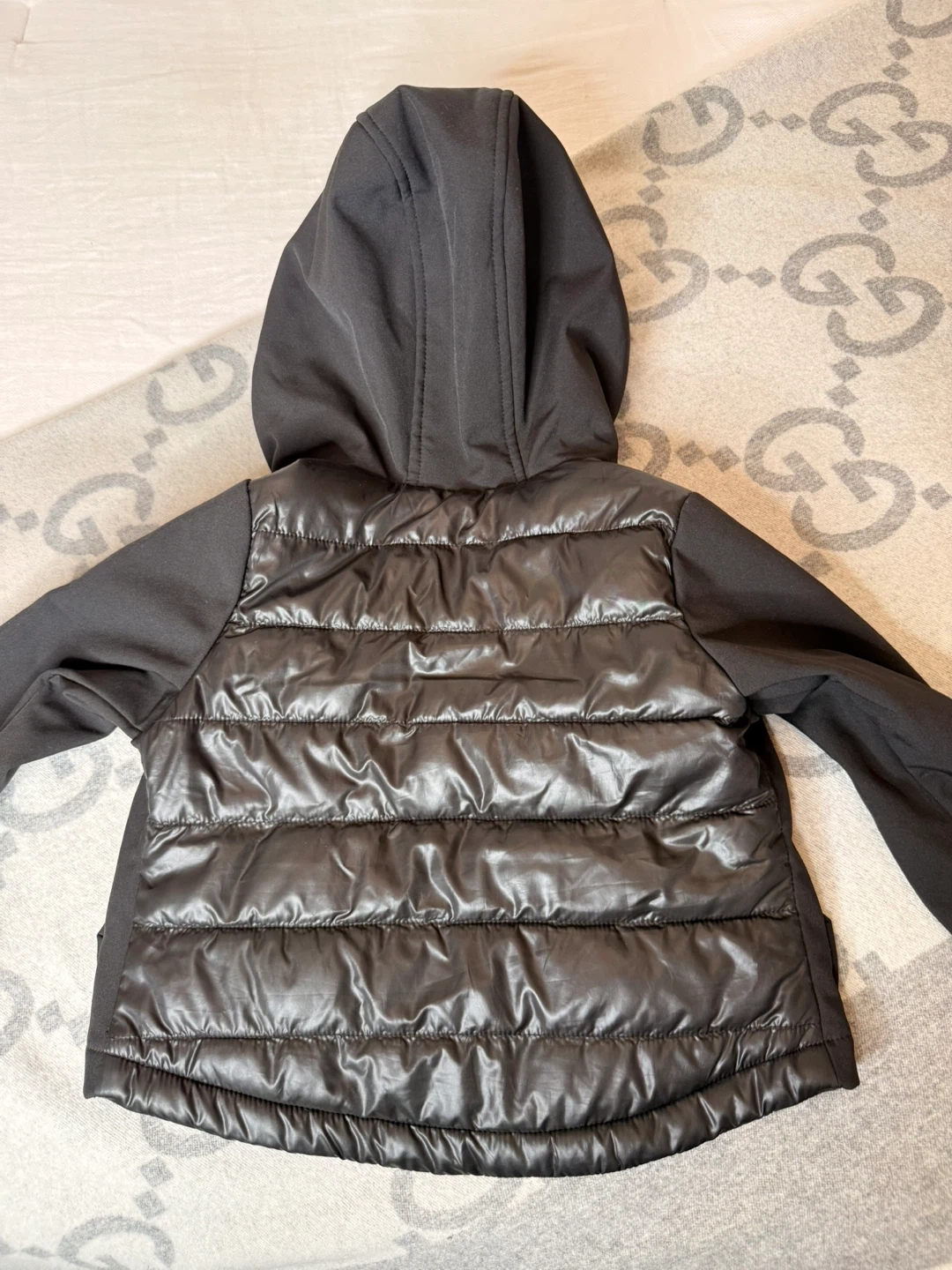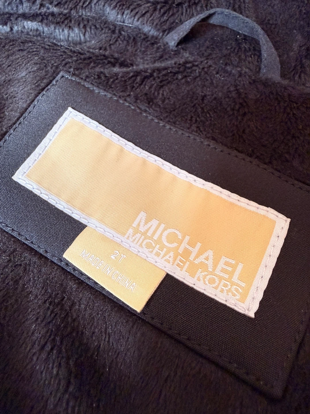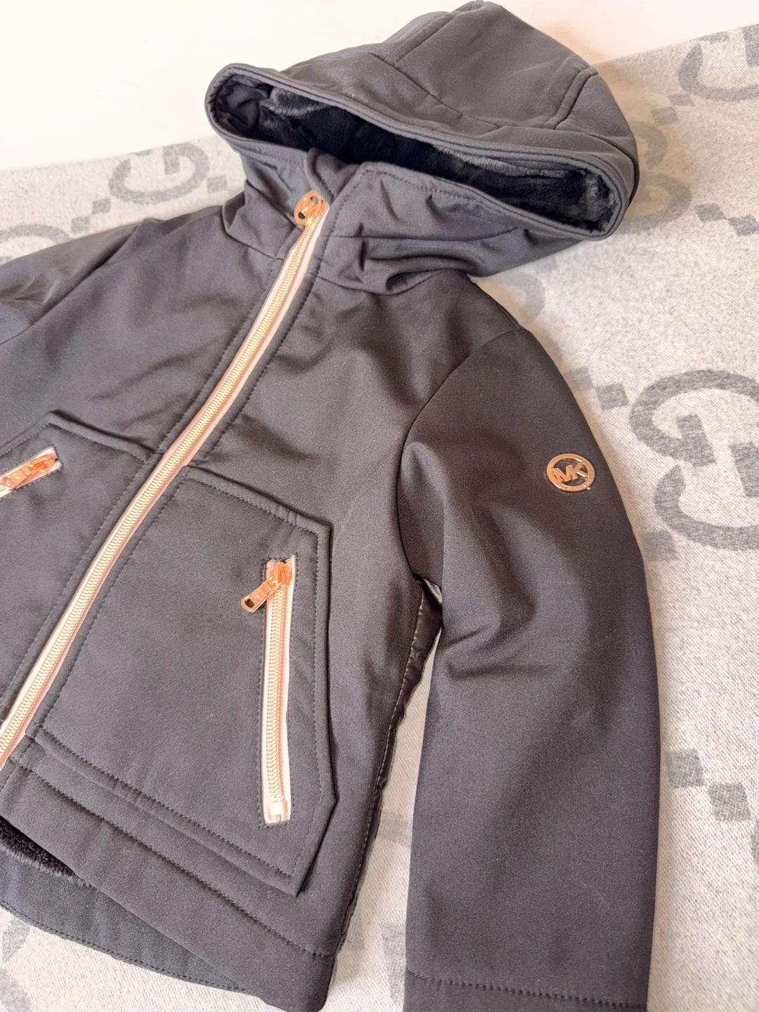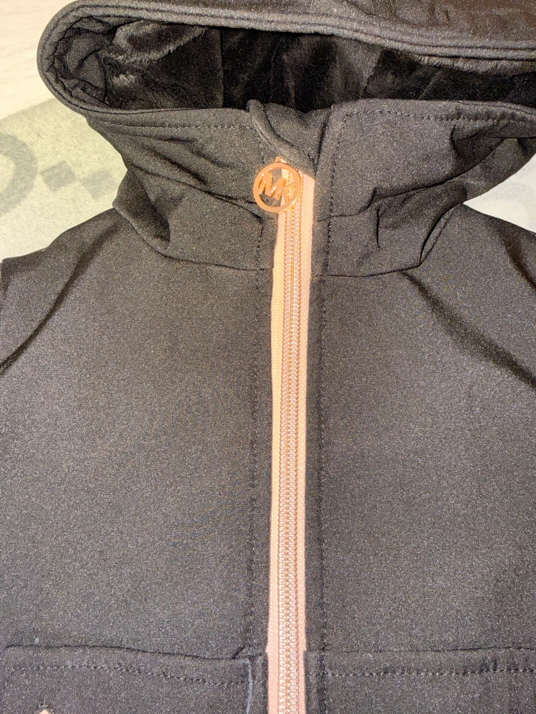 A super cute Michael Kors winter jacket for kids! It's black with rose gold zippers and details. The jacket is a size 2T and made with a shell of 92% polyester and 8% spandex, making it comfy and warm for those chilly days