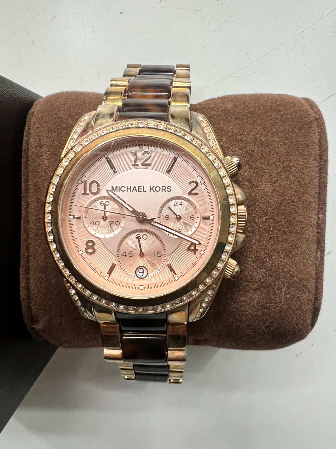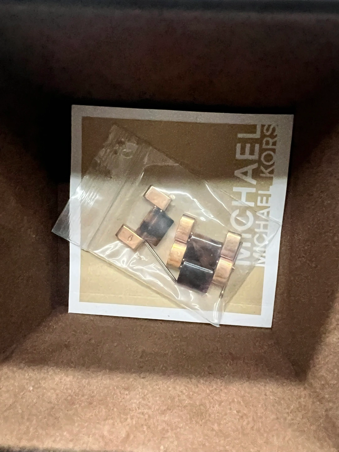 Selling a beautiful Michael Kors ladies watch in gold and brown tones! It's in great condition and comes with the original box and extra links to adjust the size if needed