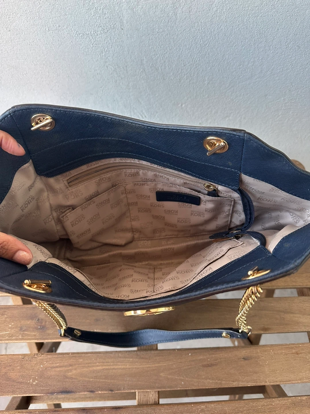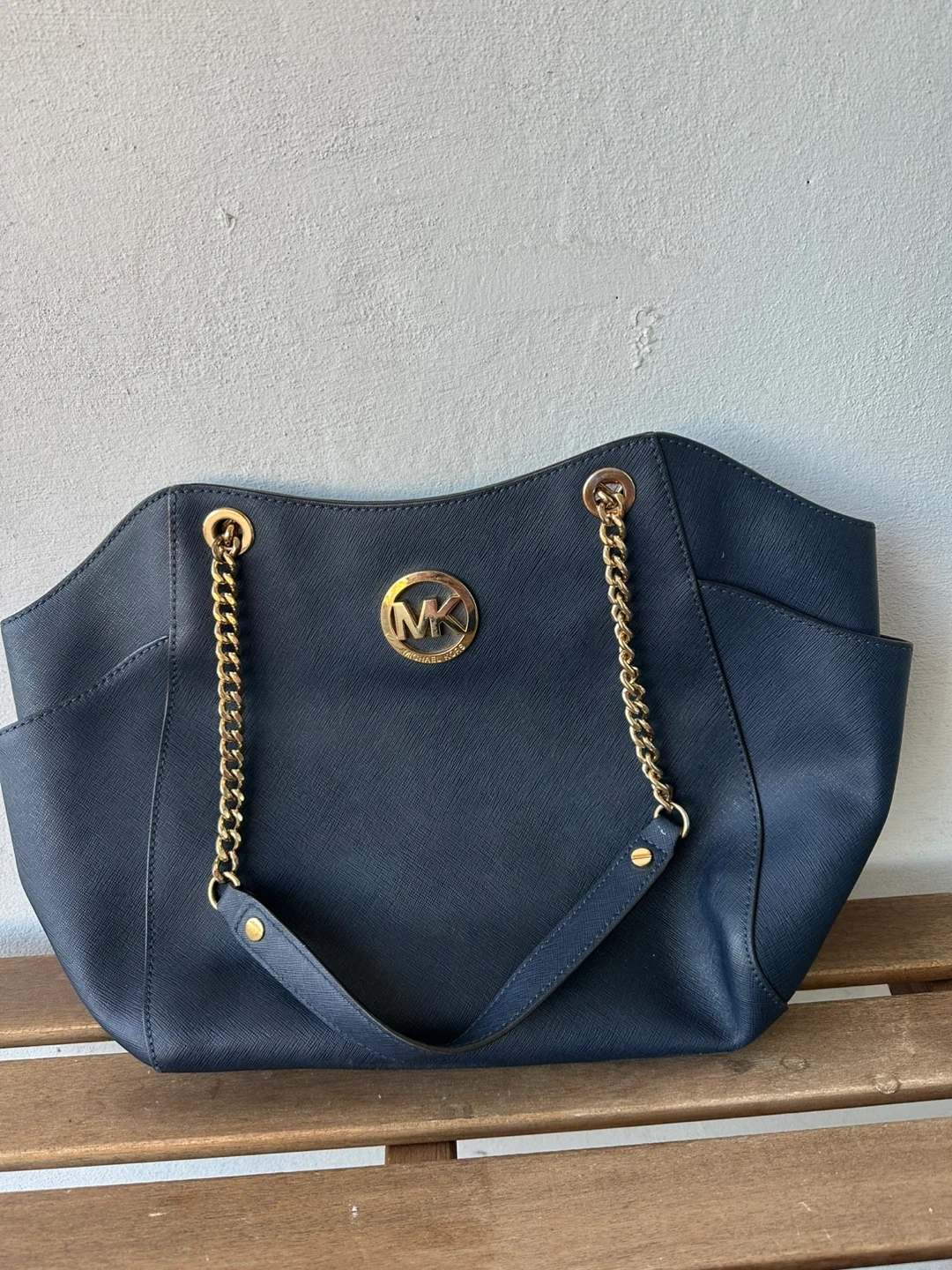 212Selling a Michael Kors tote bag in navy. It's in great condition and features gold chain detailing. Perfect for everyday use!