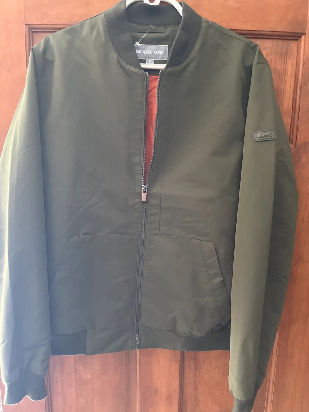 Selling a new with tags Michael Kors bomber jacket in olive green, size medium. The style number is M23592. It's in excellent condition and ready for a new home!