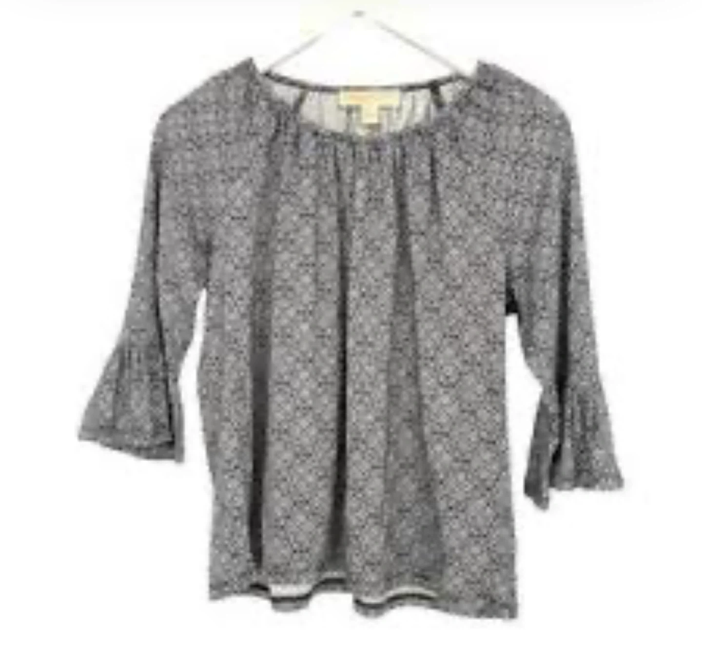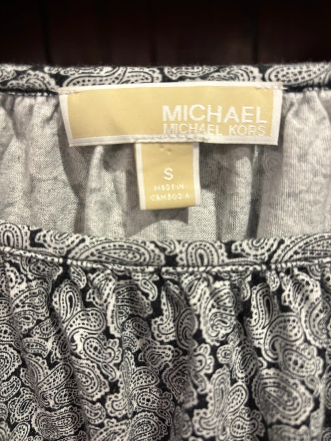9Here's a Michael Kors blouse with a pretty paisley pattern! It's a size small and has 3/4 length sleeves with a slight bell shape. Perfect for adding a touch of elegance to your wardrobe!