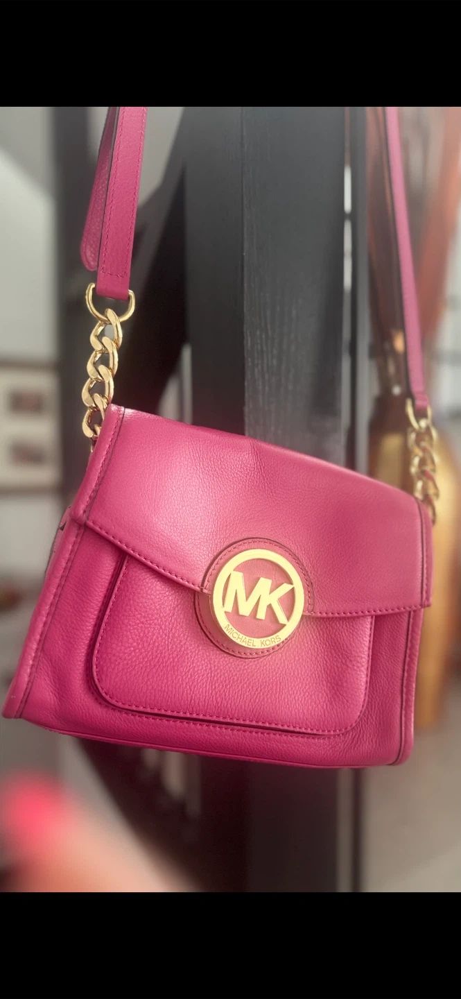 Selling a cute Michael Kors crossbody bag! It's a vibrant pink colour and features the classic MK logo in gold. The bag has a chain and leather strap. It's in great shape and barely used.