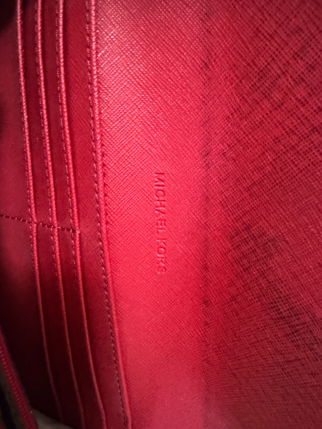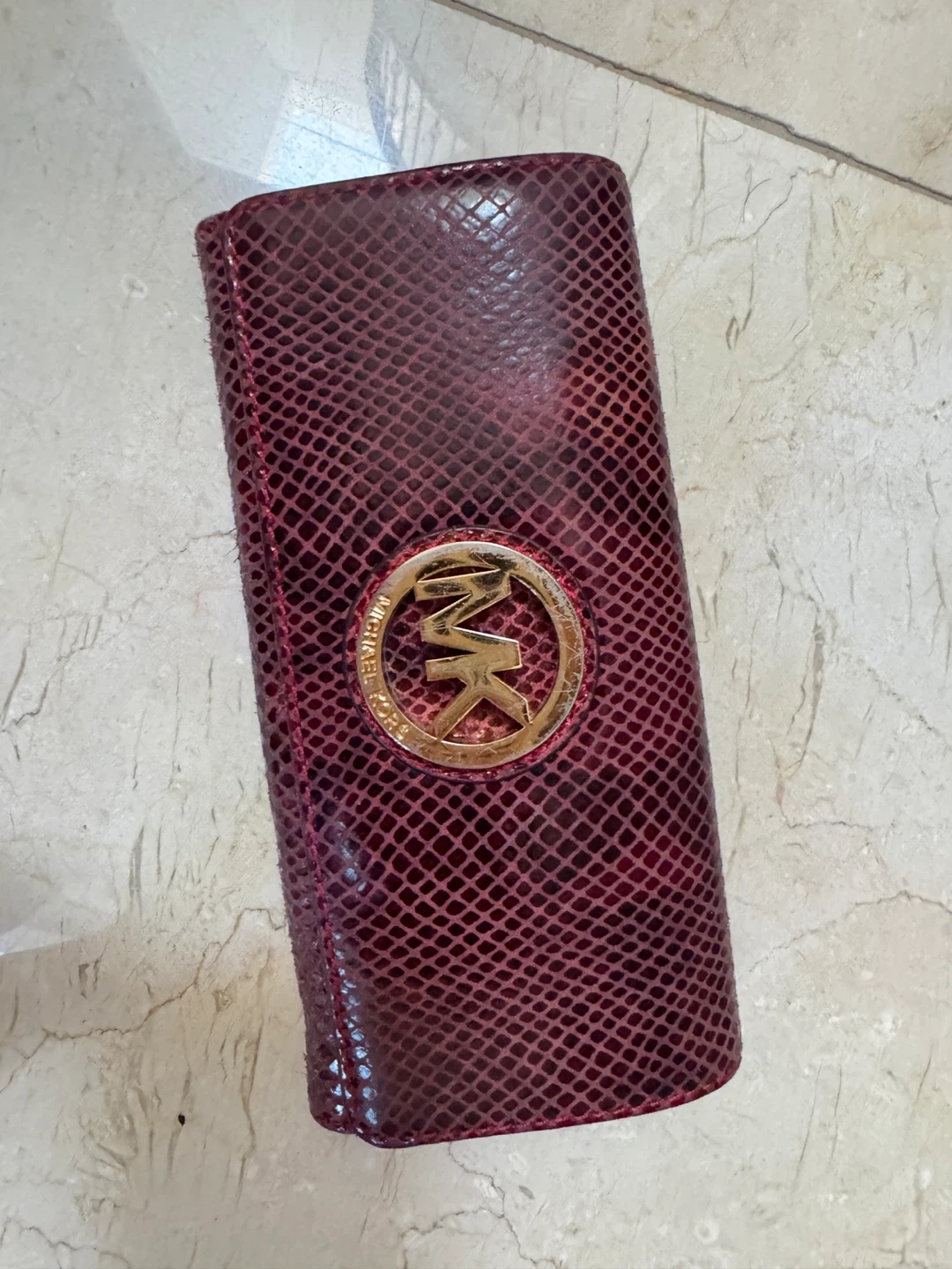 Selling a Michael Kors wallet with a red snakeskin pattern. It's in good condition and has lots of compartments for cards and cash. Perfect for everyday use!