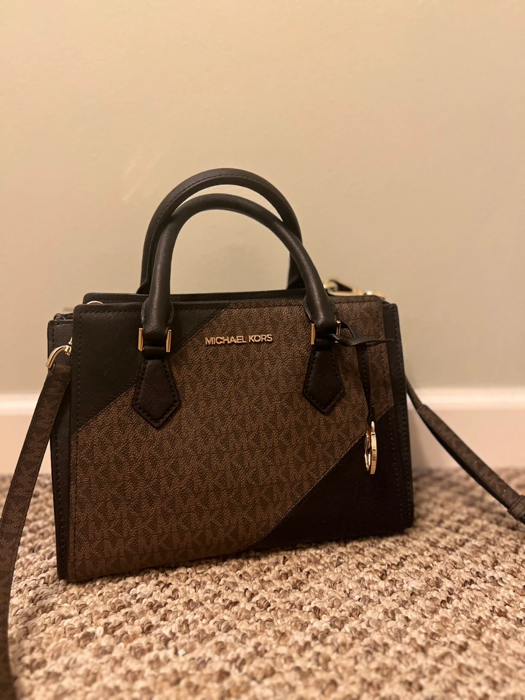10Selling a Michael Kors satchel handbag in excellent condition. It features a brown and black colour block design with the MK logo pattern. Great for everyday use!