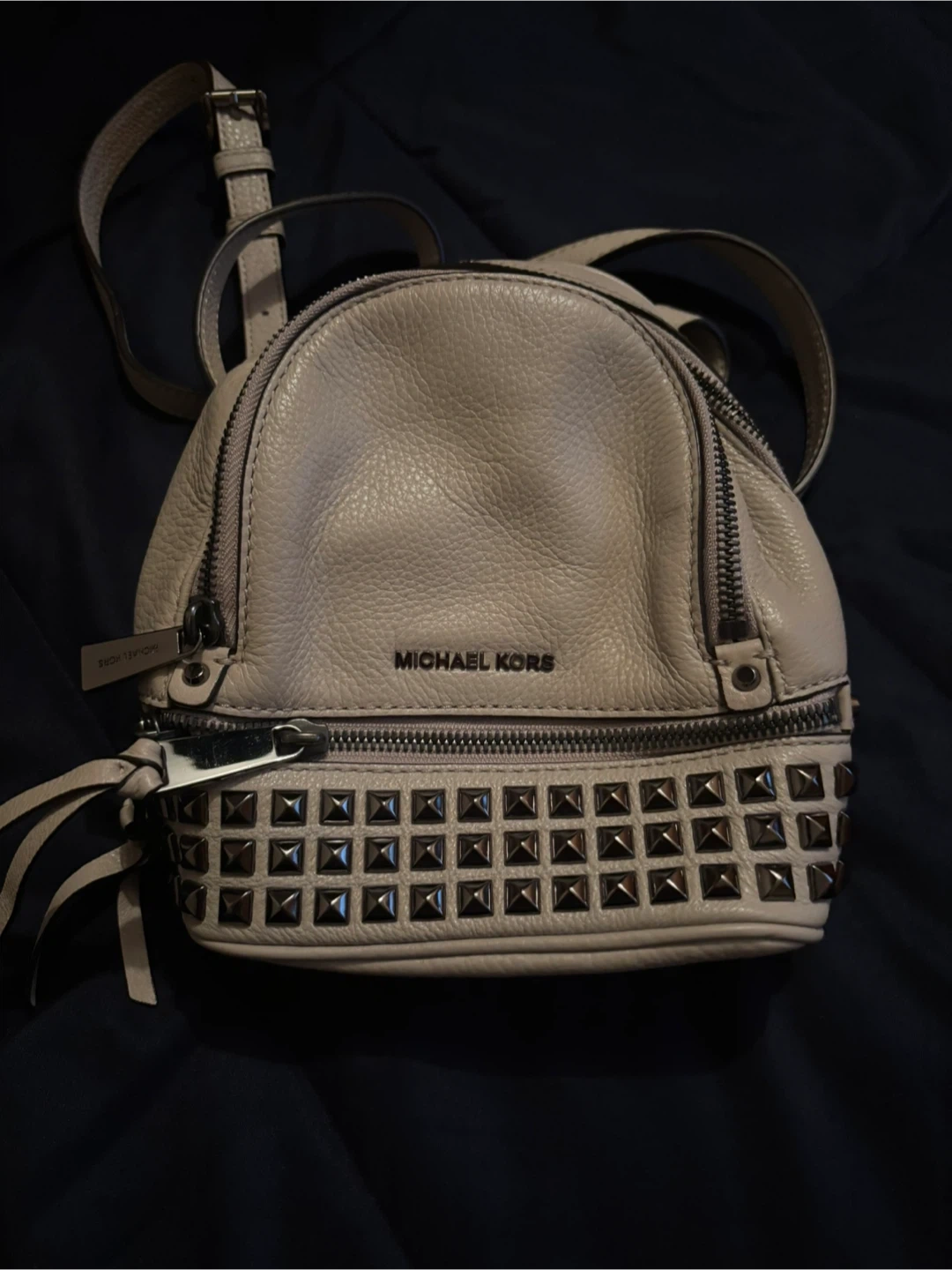 168This is a cute Michael Kors backpack in a light neutral colour. It features studded detailing. It's perfect for carrying your essentials in style!